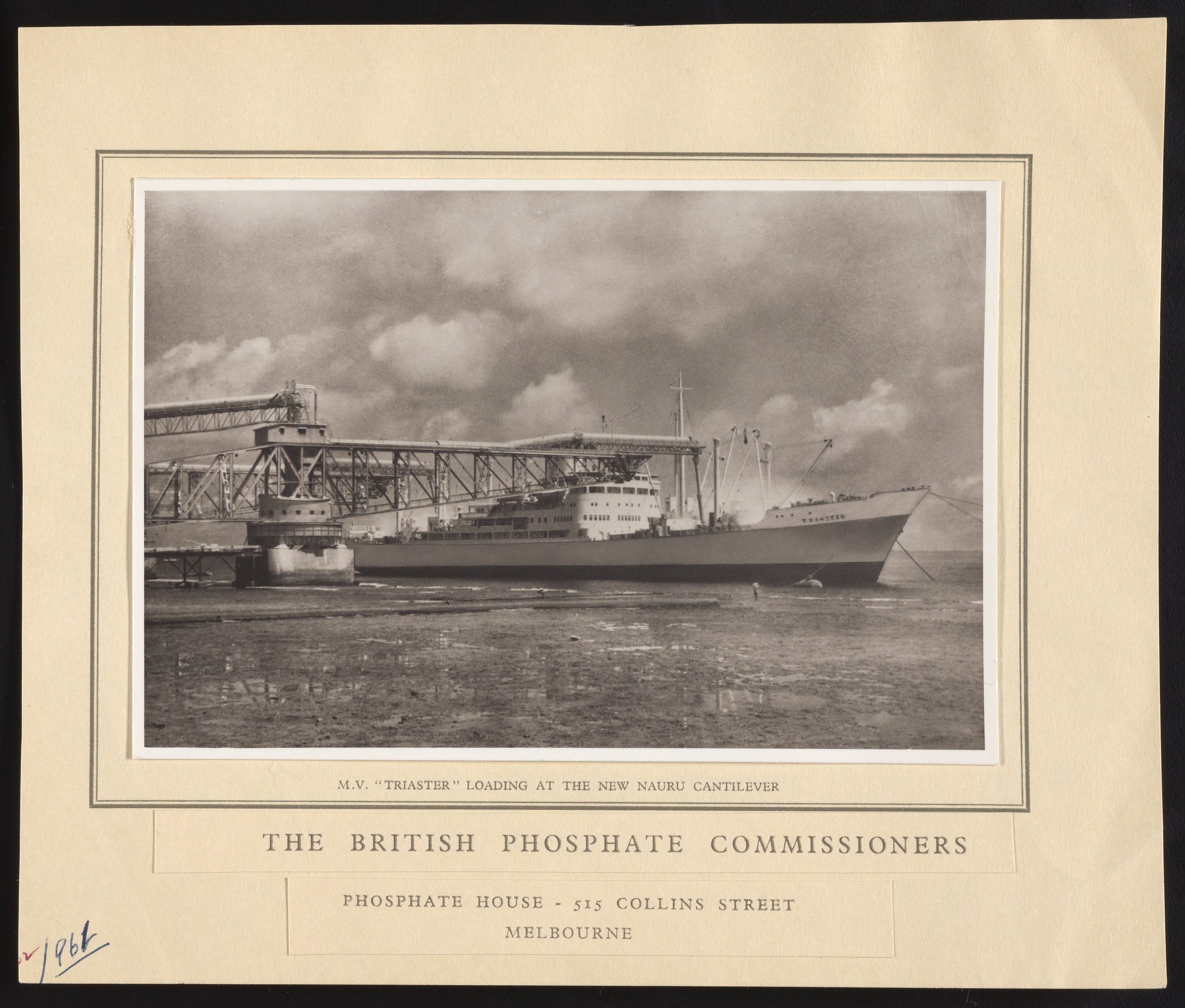 General view of the M.V. "Triaster" motor ship being loaded with phosphate at the cantilever located in Christmas Island, Nauru. This ship was managed by the British Phosphate Commissioners, a board of representatives from Australia, Great Britain, and New Zealand who managed the extraction of phosphate from Christmas Island, Nauru, and Banaba Island (Ocean Island) from 1920 to 1981.