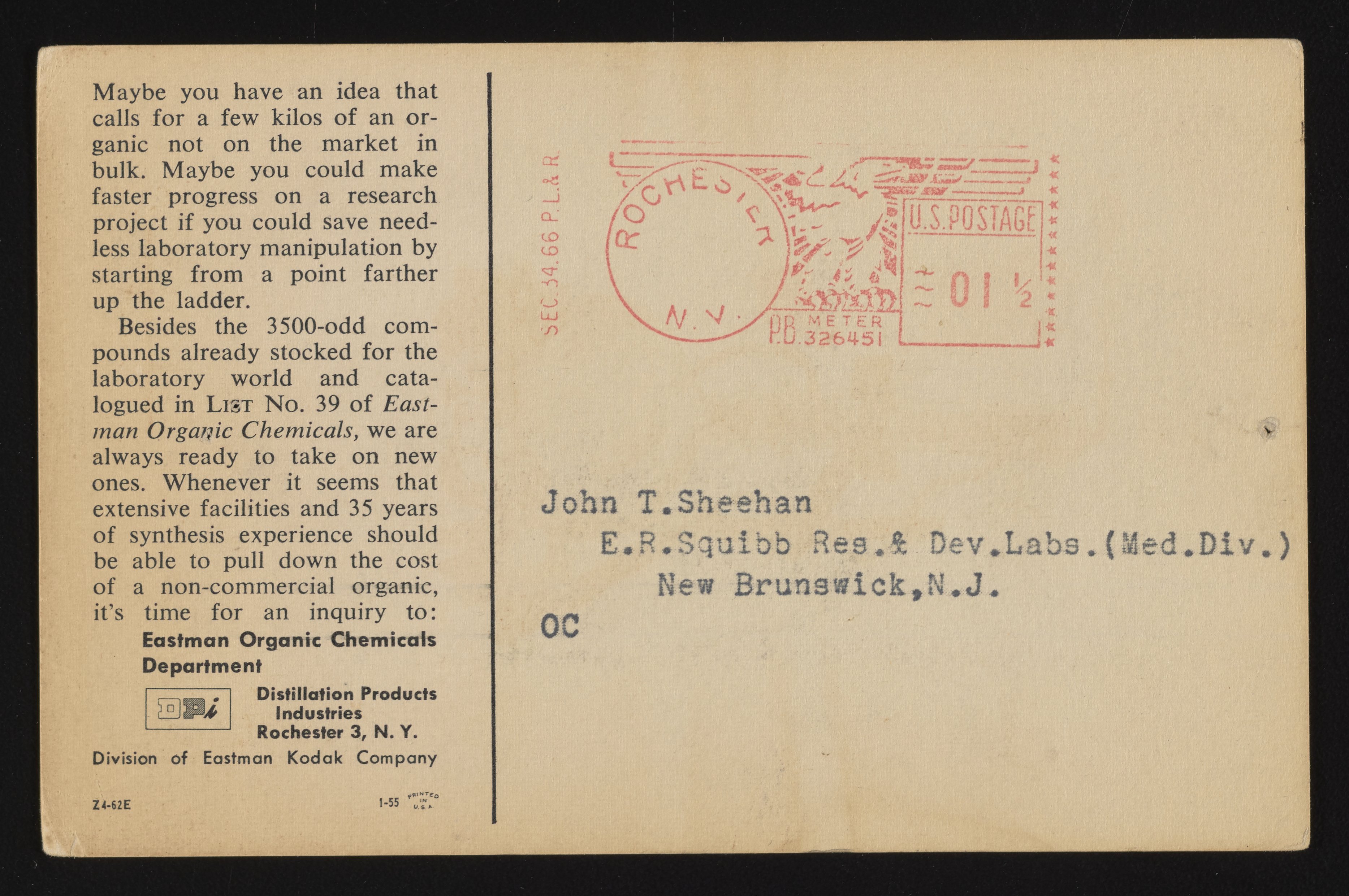 Eastman Kodak Company. “It's Better to Get It from Eastman!” Rochester, New York, 1950–1959. John C. Sheehan Collection of Chemical Advertisements, Box 1. Science History Institute. Philadelphia. https://digital.sciencehistory.org/works/w8c423y.