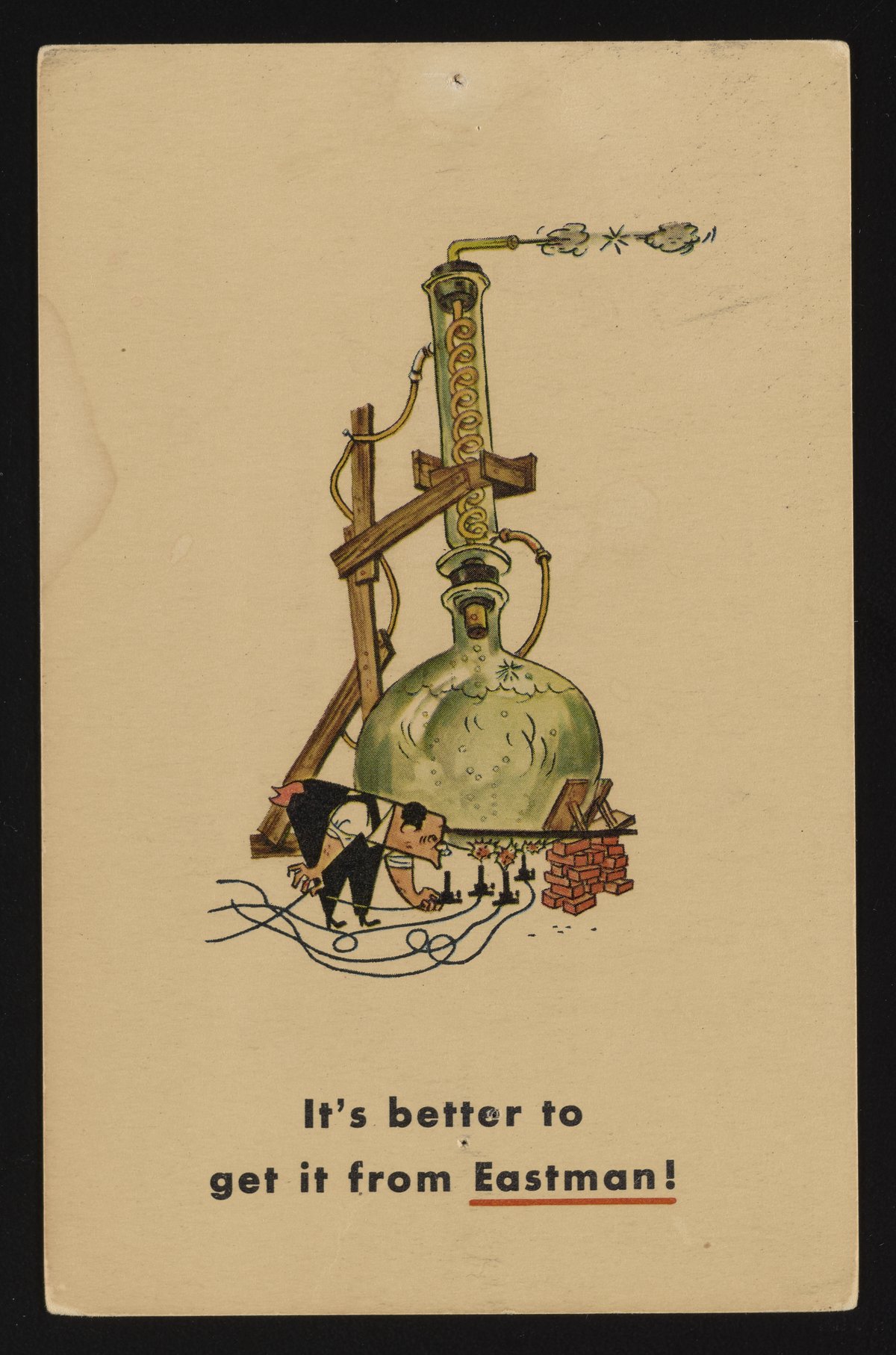 Front and back of an illustrated color postcard advertising the products and services of the Eastman Organic Chemicals Department (Division of the Eastman Kodak Company). The postcard features a humorous depiction of a man attempting to brew his own chemicals using a make-shift apparatus. Postmarked from Rochester, New York, the postcard also includes a brief summary of Eastman’s available stock of chemical compounds as they pertain to the “chemical businessman.”