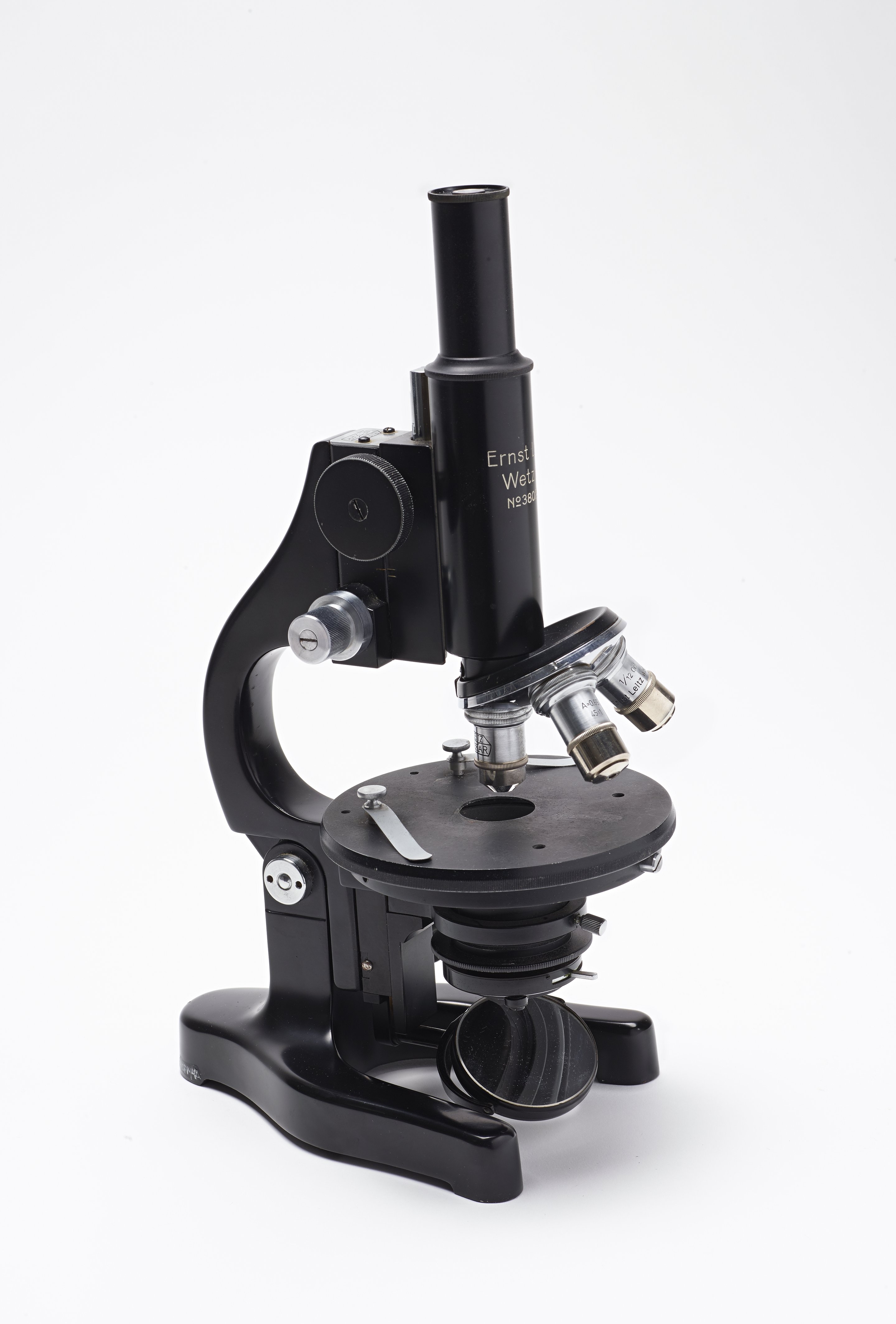 Ernst Leitz oil-immersion microscope; instrument rests on wishbone-shaped base with a single beam extending from the center before splitting into two sections: an arm supporting the telescope and microscopic lenses and a round stand for slides; below the stage is a double-sided mirror that rotates 360 degrees; the stage has a round hole in the middle allowing light to come up through the mirror and two metal stage clips that pivot to hold slides in place; an additional lens below the stage helps focus the light; the telescope has a monocular eye piece with 8x magnification and a rotating nose with three objective lenses (3, 6L, and 1/12); the telescope arm can be raised and lowered using knobs on the side.