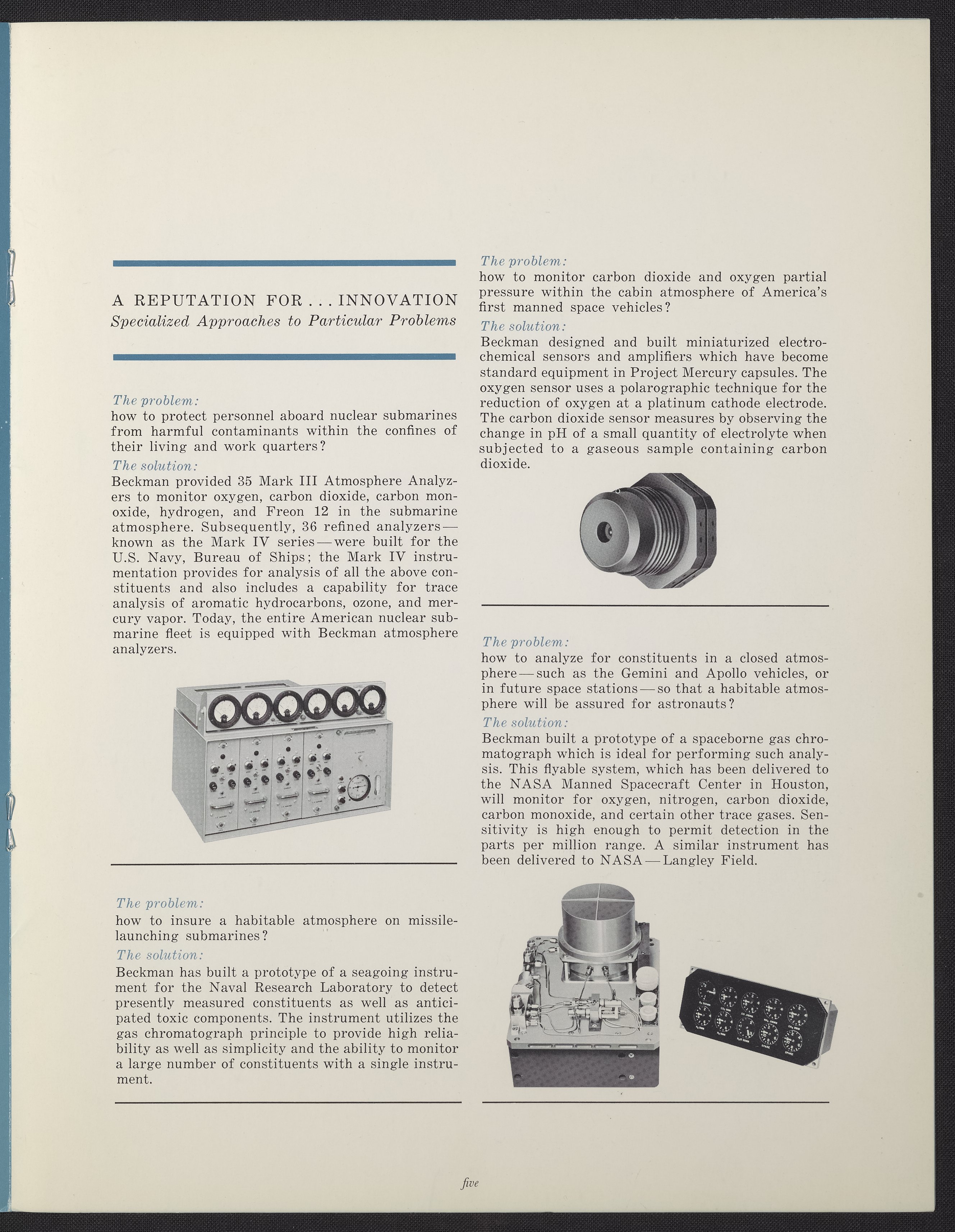 Small JPG1200 x 1530px — 226 KBFull-sized JPG2689 x 3428px — 1.4 MBOriginal fileTIFF — 2689 x 3428px — 26.4 MBThe brochure provides an overview of Beckman's divisions--Berkeley, Helipot, Offner, Scientific and Process Instruments, Special Projects, Spinco, and Systems--and highlights solutions provided to clients needing instruments to perform atmosphere analysis, lunar soil analysis, hydrocarbon detection, and water purification.