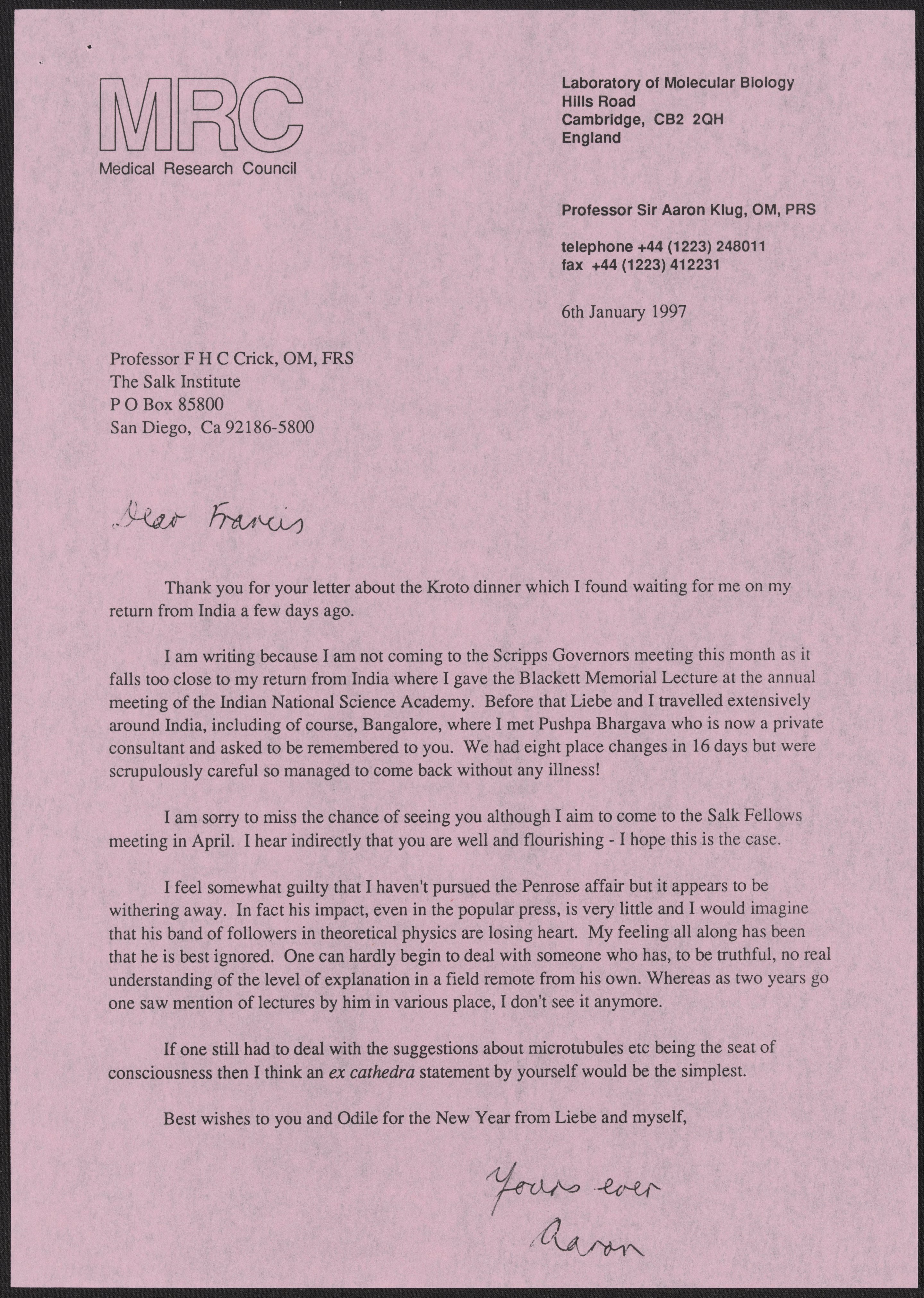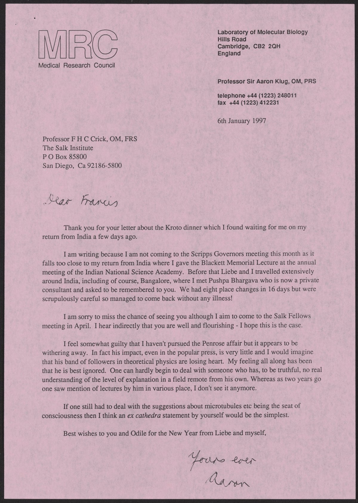 Letter from Aaron Klug to Francis Crick, January 6, 1997