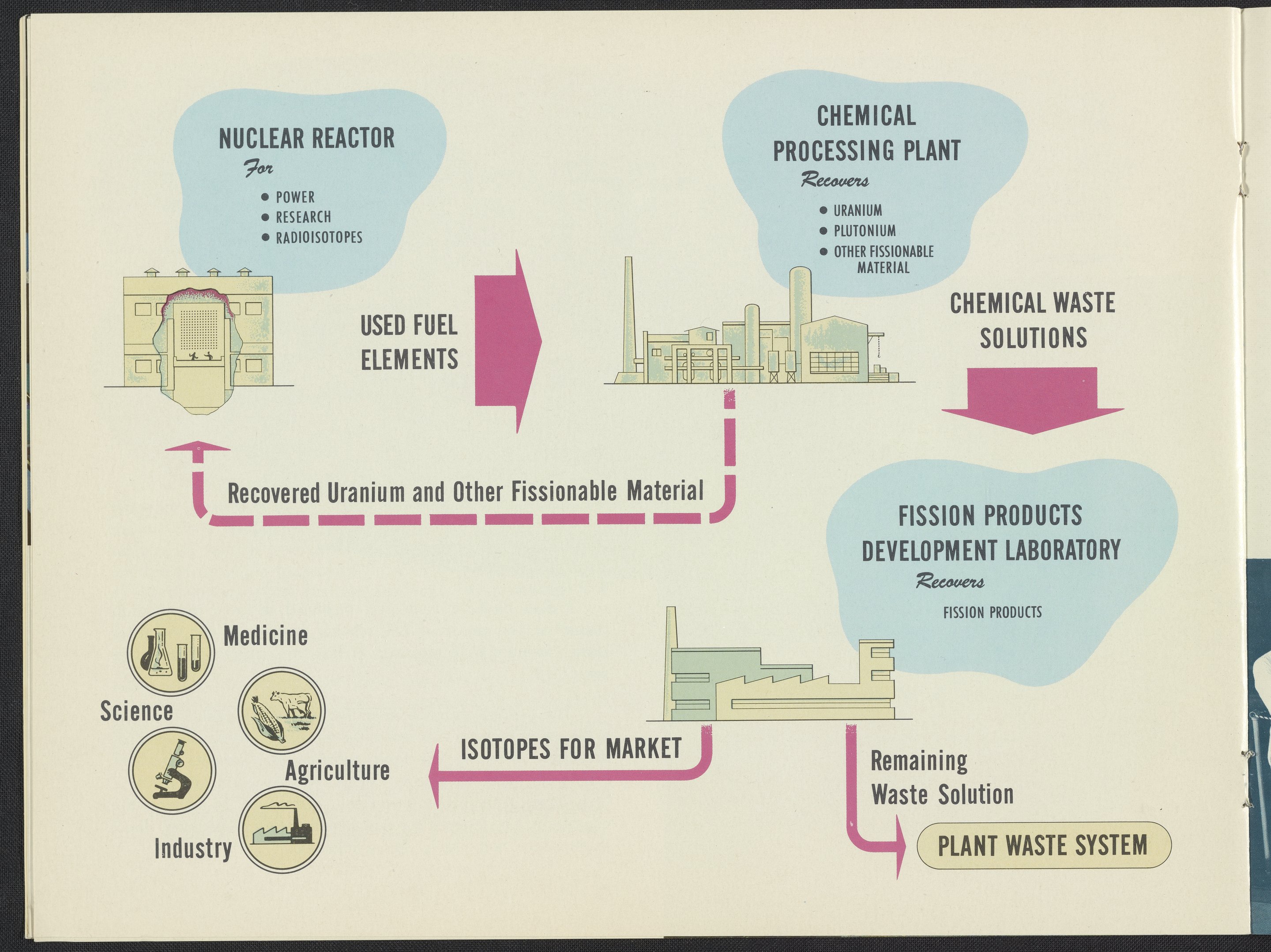 An illustrated infographic of the basic process of fission materials and waste from the nuclear reactor to chemical processing plant to the fission products development laboratory becoming isotopes for market or nuclear plant waste.