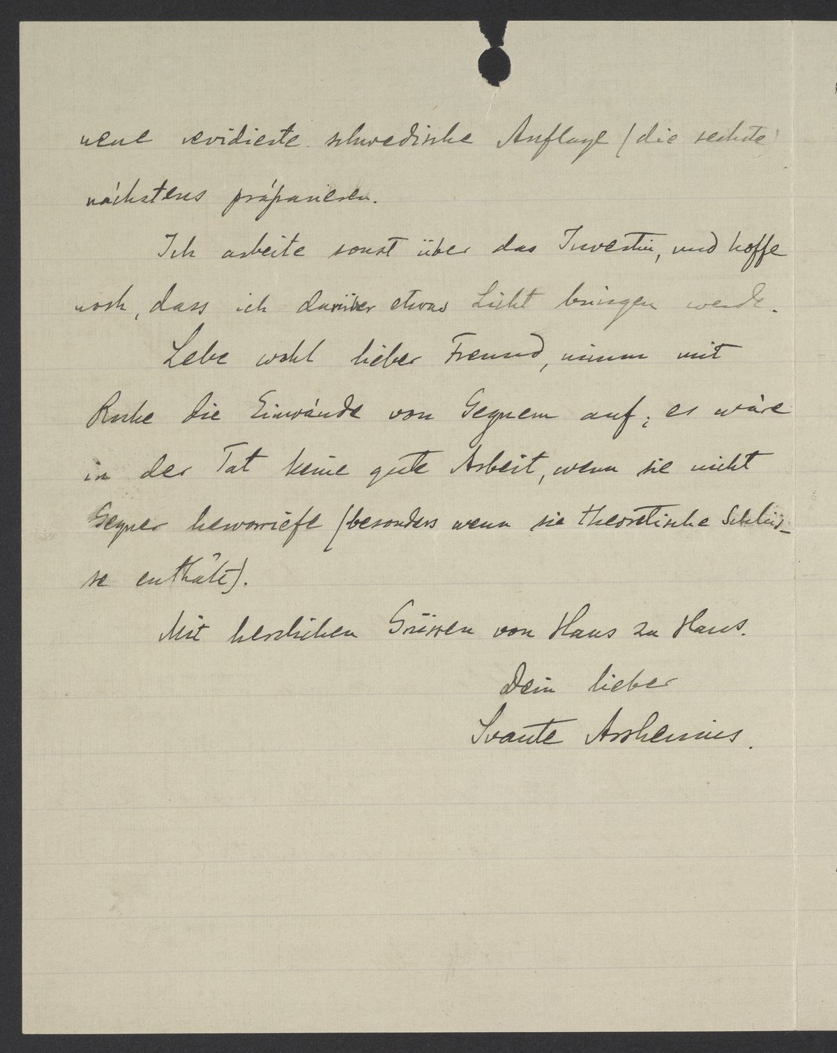 Ich danke Dir sehr für Deinen sehr freundlichen Brief, den ich umgehend beantworte. Was den Nobelvorschlag betrifft, so hat die Sache mit Ostwald schon grosse Schwierigkeit, weil die Satzungen eine Entdeckung oder Verbesserung, die in jüngster Zeit eingeführt ist, verlangt. Vielleicht könnte man in seinem Lehrbuch (neue Aufl.) etwas auffinden, worin er wichtige theoretische Beleuchtungen gemacht hat. Wenn seine kinetischen und elektrochemischen Arbeiten neuen Datums wären (aber sie sind schon 20 Jahre alt) so wären sie ja höchst vortrefflich. Seine übrigen Verdienste können ja als eine Stütze ausgeführt werden, dafür dass er auch in