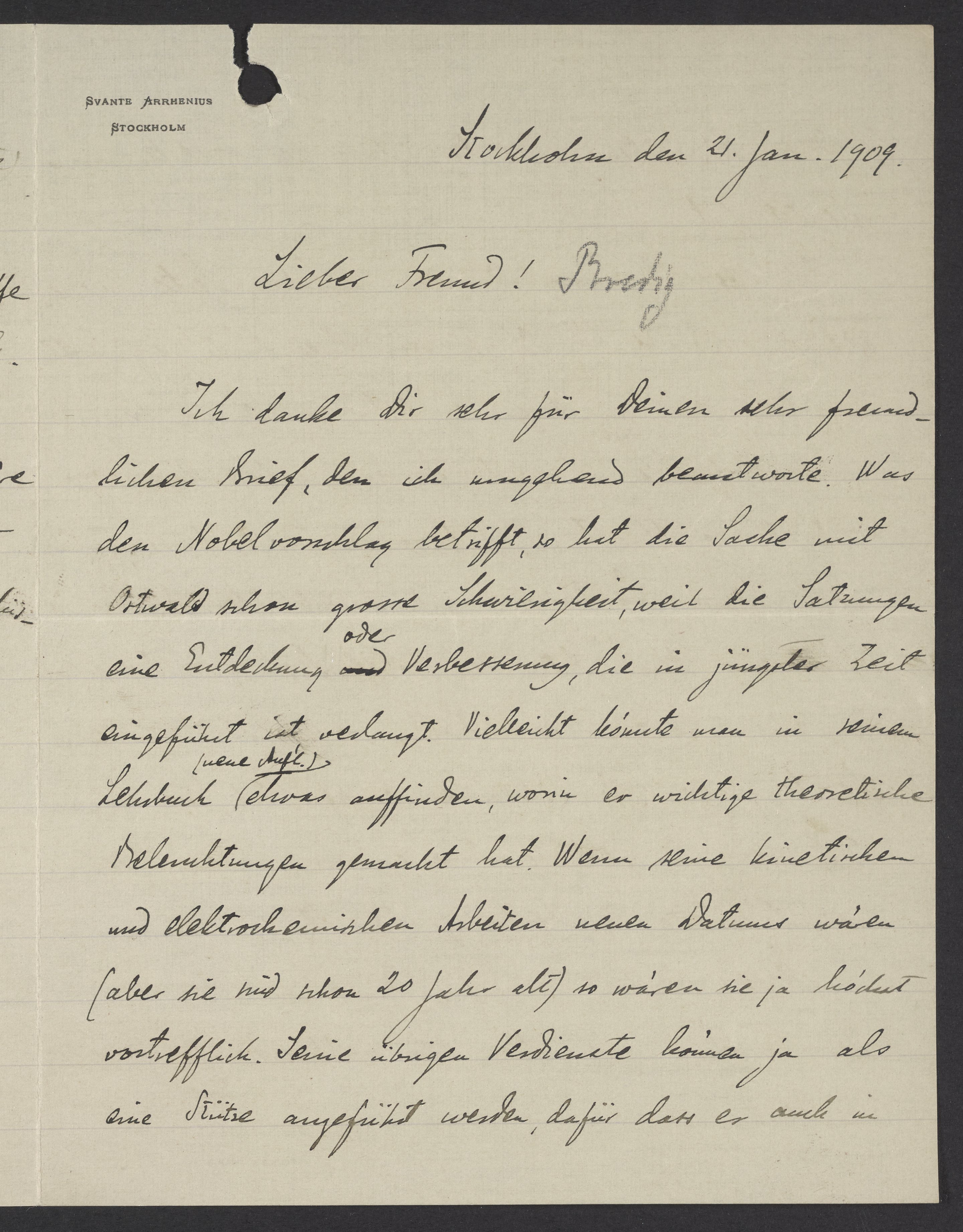 Arrhenius, Svante. “Letter from Svante Arrhenius to Georg Bredig, January 1909,” January 21, 1909. Papers of Georg and Max Bredig, Box 1, Folder 4. Science History Institute. Philadelphia. https://digital.sciencehistory.org/works/wdr1cqd.