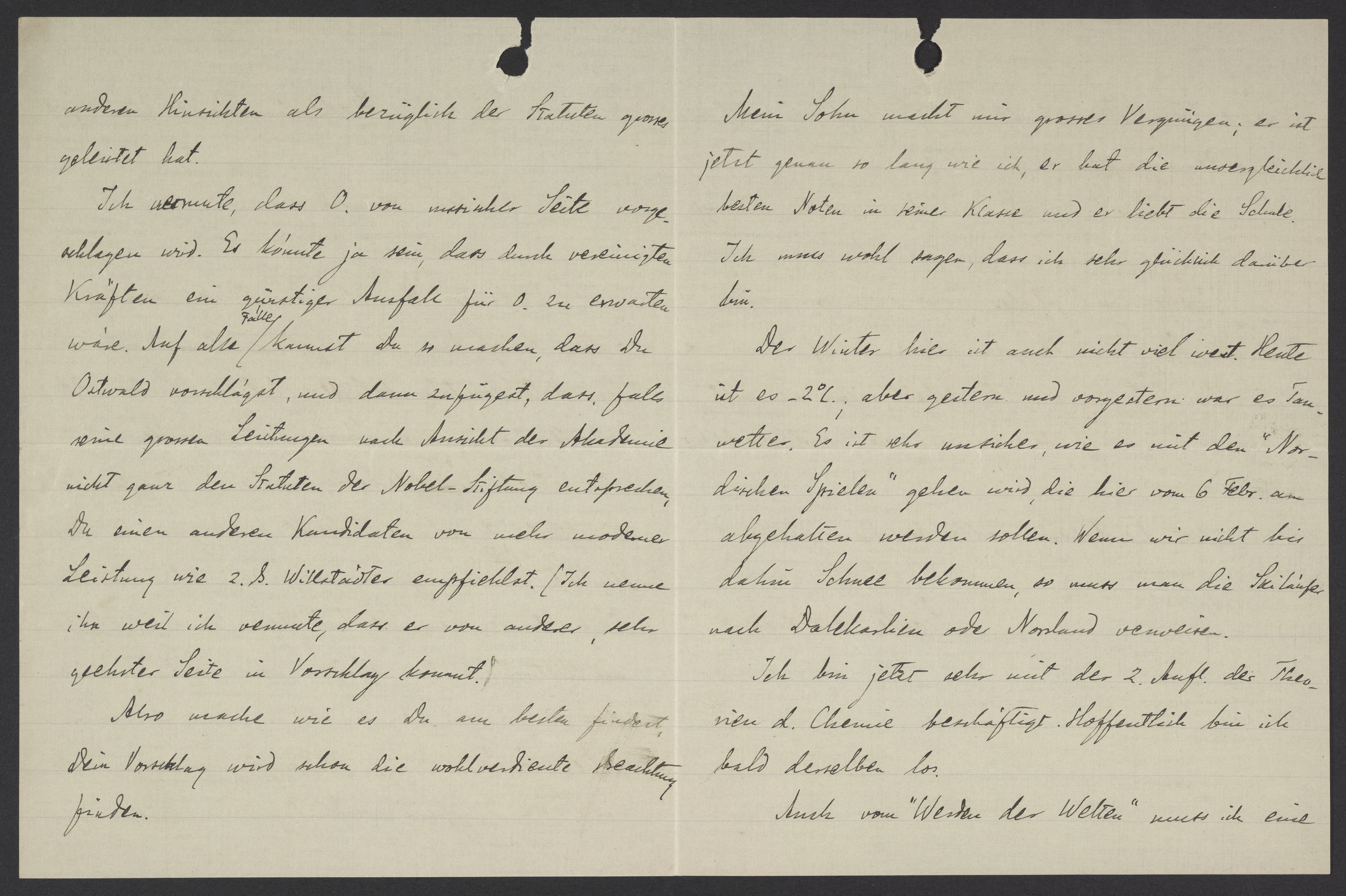 Thank you very much for your kind letter, which I am answering immediately. With regards to the Nobel prize, Ostwald’s nomination faces challenges because the statutes require a discovery or improvement that has never been previously introduced. It would perhaps be possible to find something in his textbook (the new edition), in which he made important theoretical statements. If his kinetic and electrochemical works were new (they are already 20 years old), they would be exceptional. As a supporting factor, his other merits can be mentioned because according to the statutes, he has achieved a great deal.