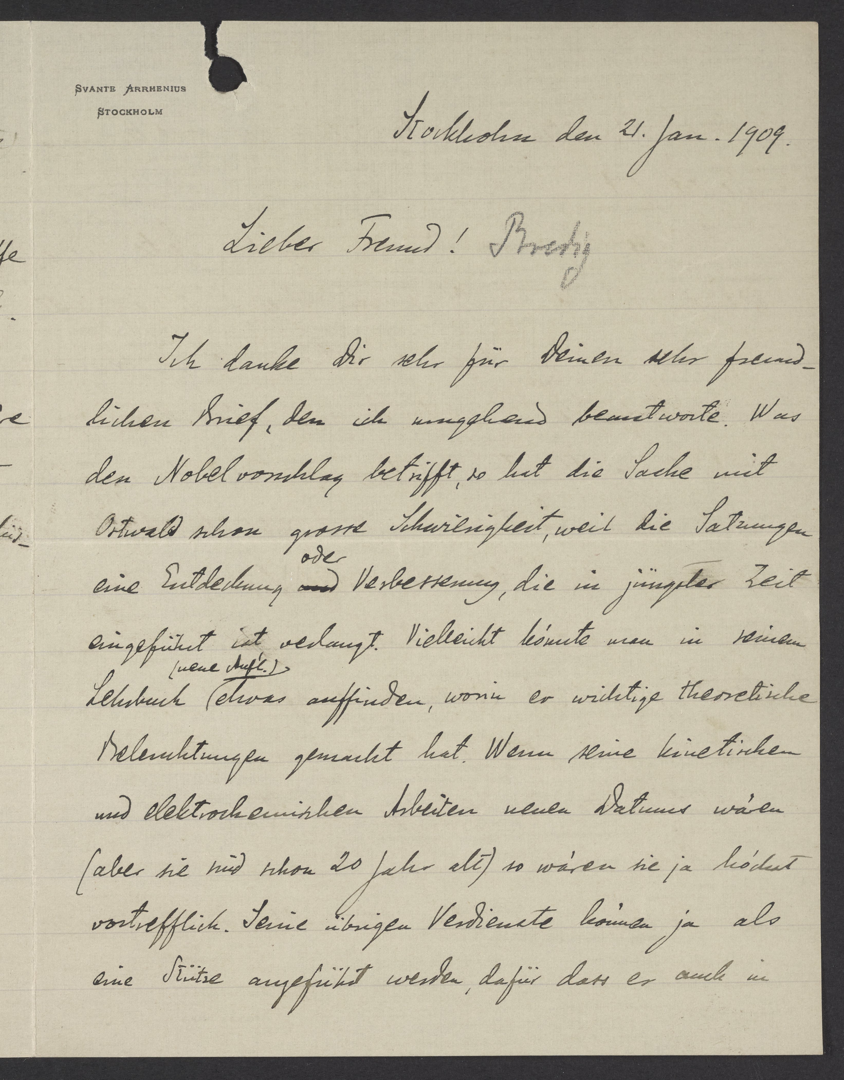 Thank you very much for your kind letter, which I am answering immediately. With regards to the Nobel prize, Ostwald’s nomination faces challenges because the statutes require a discovery or improvement that has never been previously introduced. It would perhaps be possible to find something in his textbook (the new edition), in which he made important theoretical statements. If his kinetic and electrochemical works were new (they are already 20 years old), they would be exceptional. As a supporting factor, his other merits can be mentioned because according to the statutes, he has achieved a great deal.