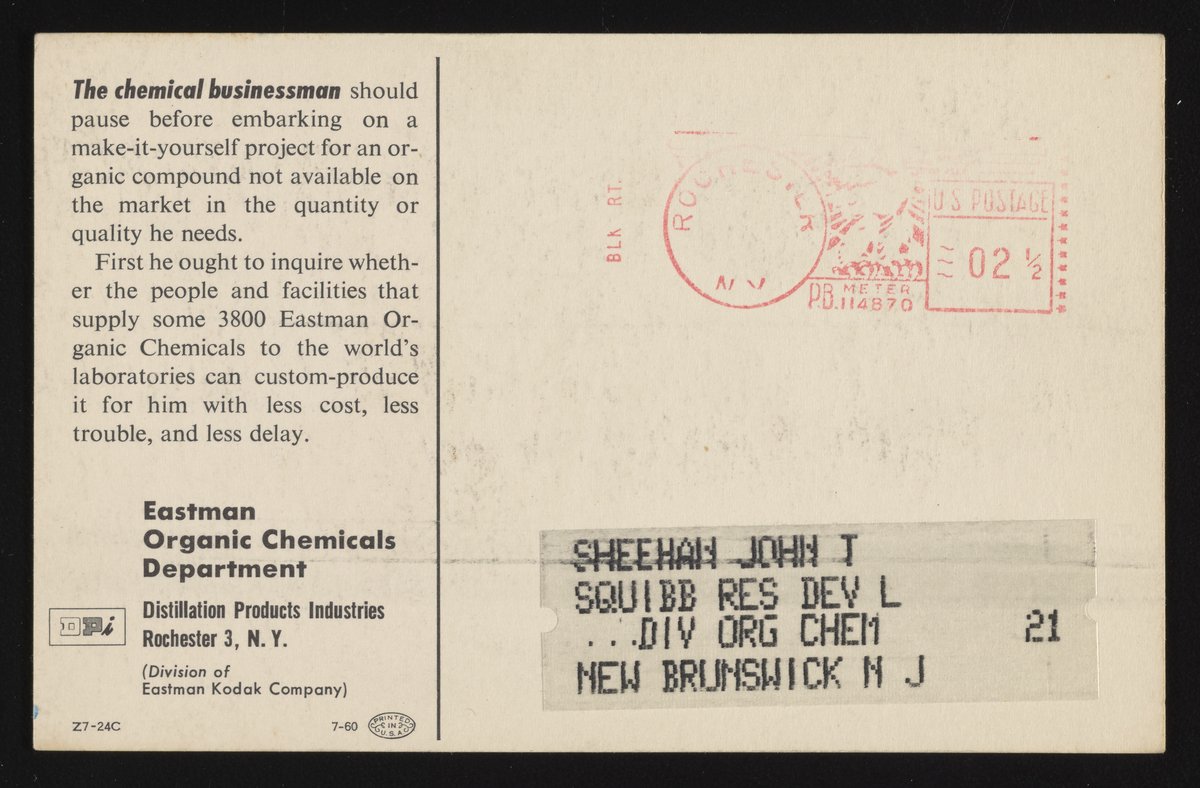 Front and back of an illustrated color postcard advertising the products and services of the Eastman Organic Chemicals Department (Division of the Eastman Kodak Company). The postcard features a humorous depiction of a harried-looking man attempting brewing his own chemicals. Postmarked from Rochester, New York, the postcard also includes a brief summary of Eastman’s available stock of chemical compounds as they pertain to the “chemical businessman.”