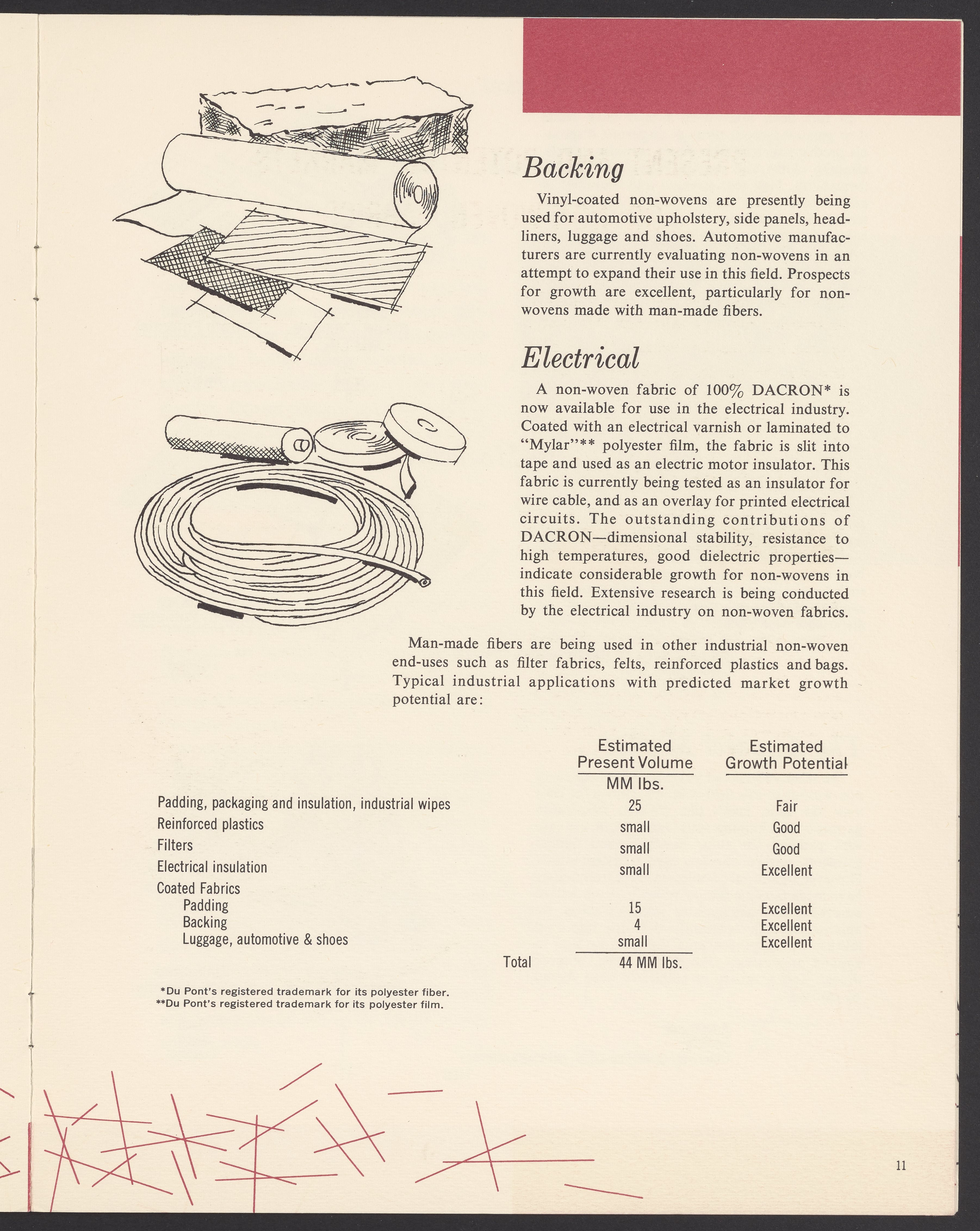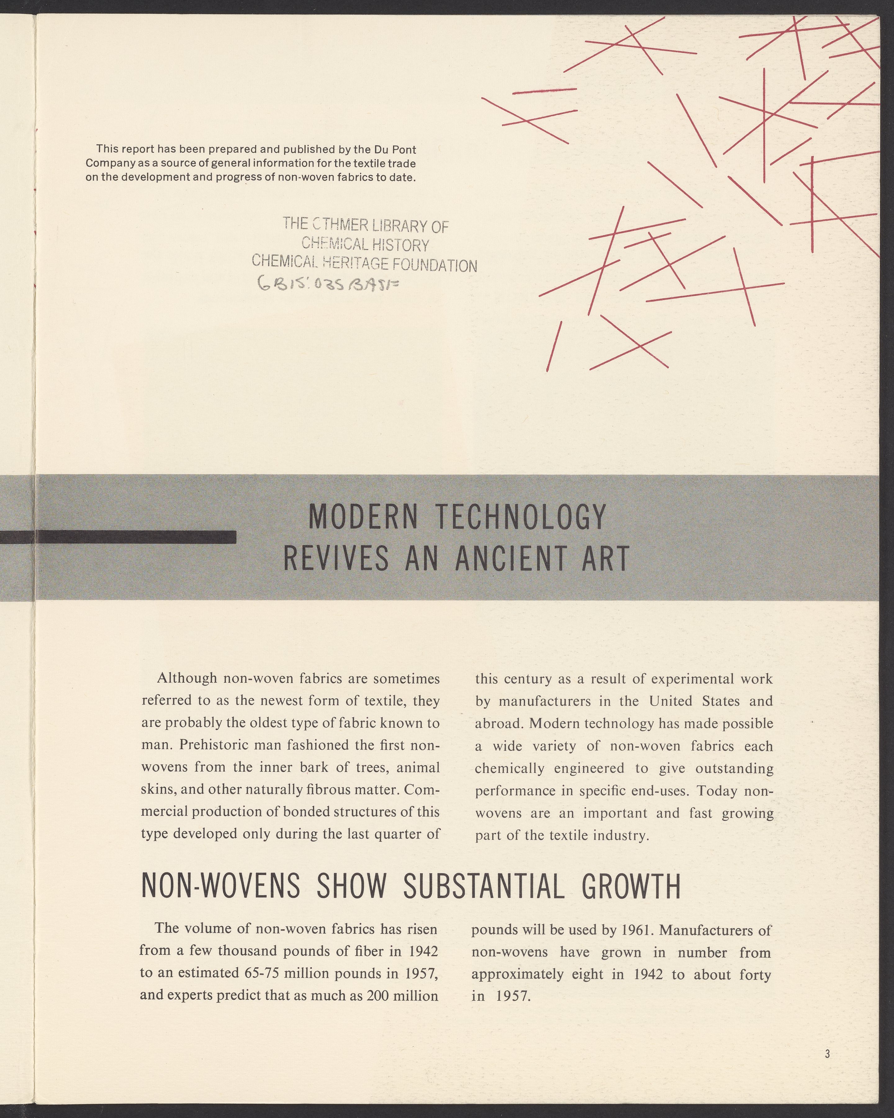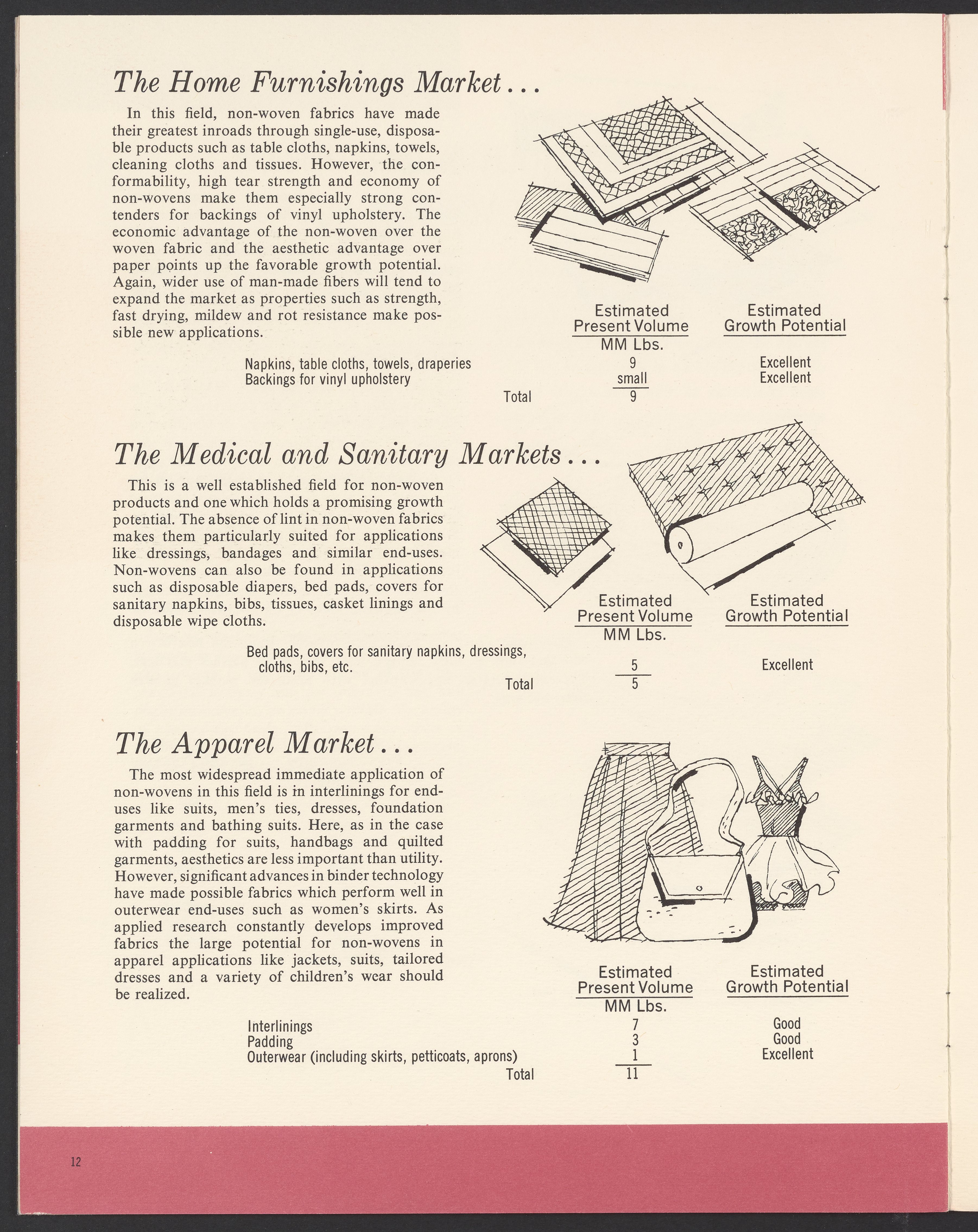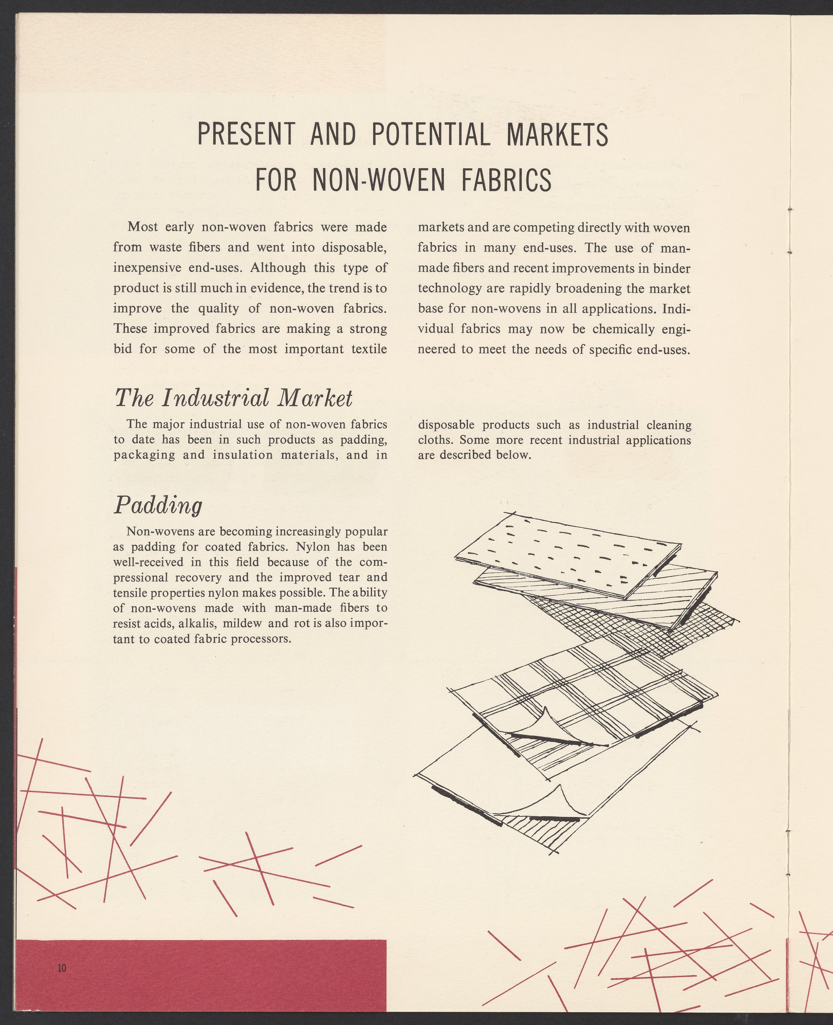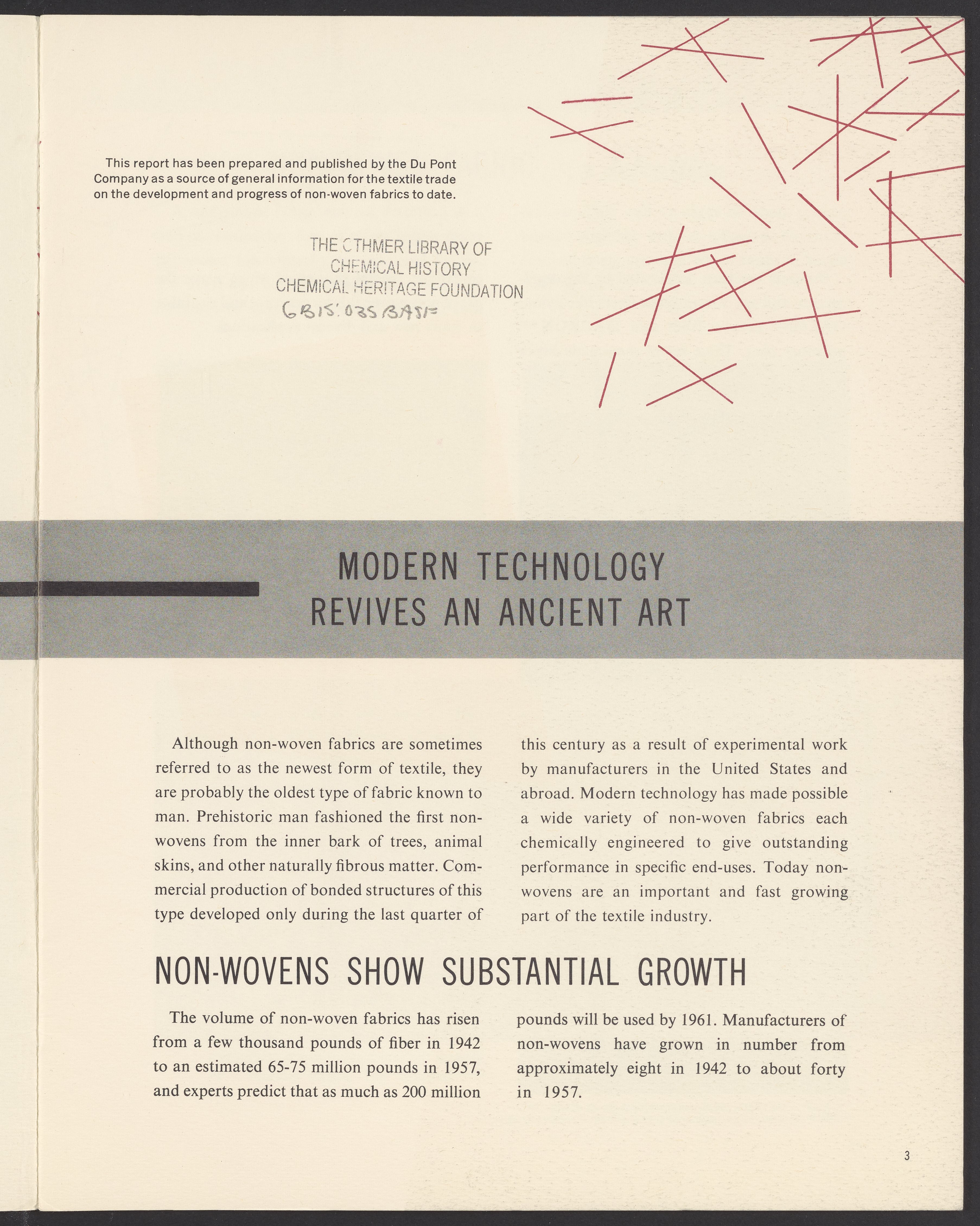 E.I. du Pont de Nemours & Company. New Opportunities in Non-Woven Fabrics... A Report by Du Pont. Wilmington, Delaware: E.I. du Pont de Nemours & Company, circa 1957. https://digital.sciencehistory.org/works/wg3wv4d.