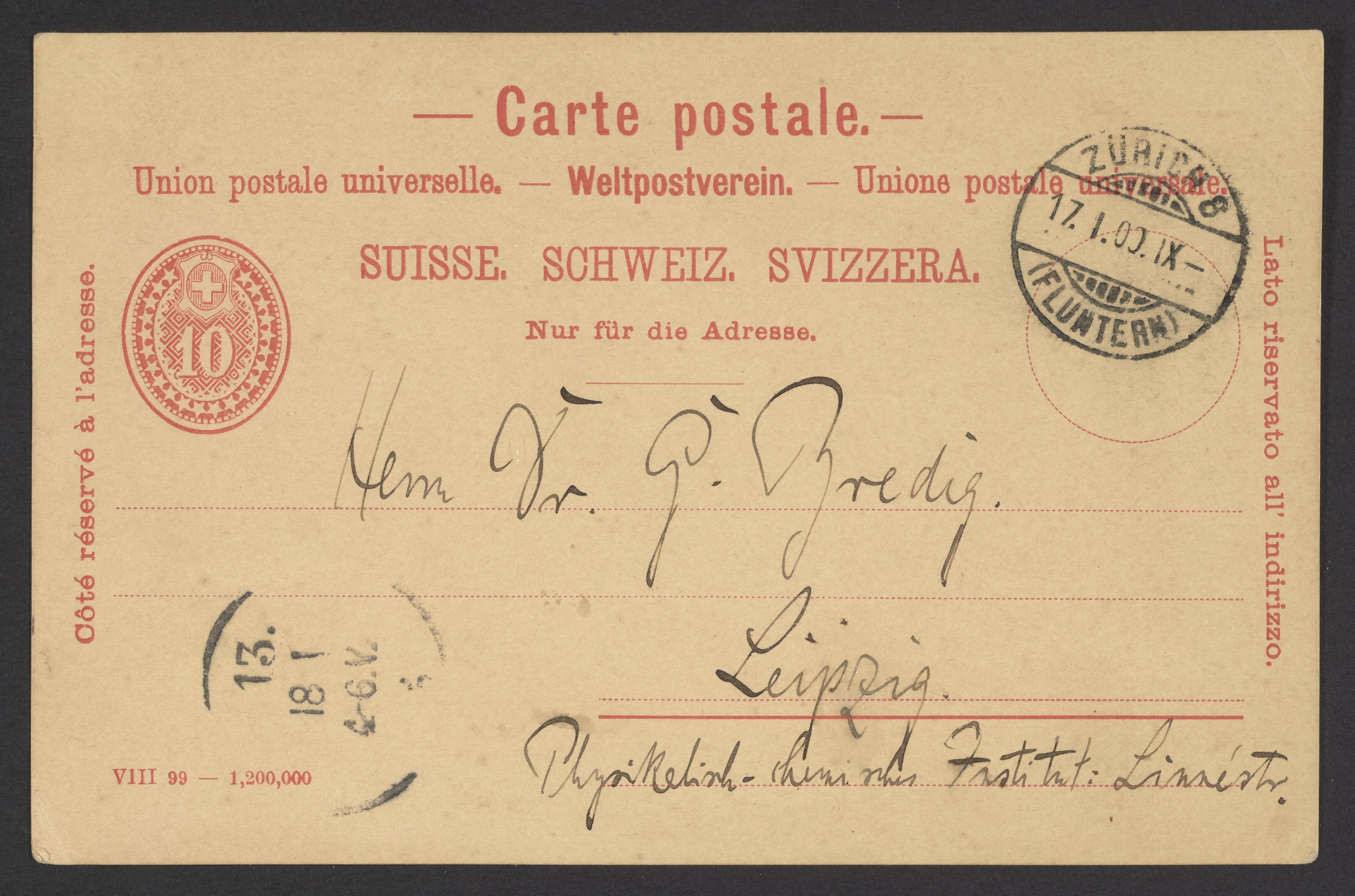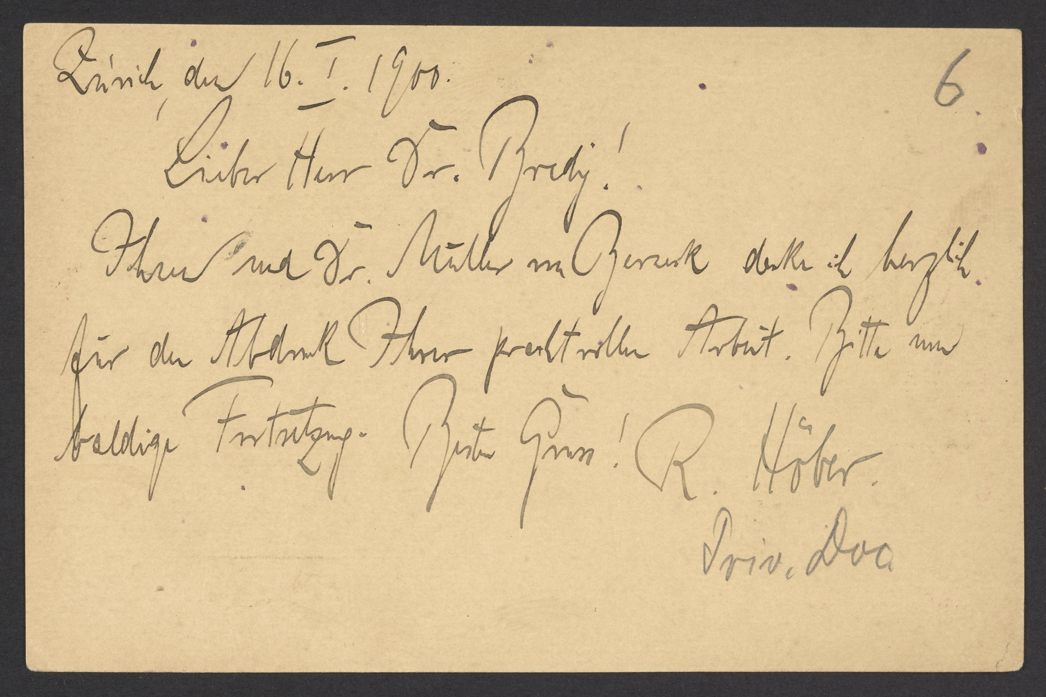 Höber, Rudolf. “Postcard from Rudolf Höber to Georg Bredig,” January 16, 1900. Papers of Georg and Max Bredig, Box 1, Folder 59. Science History Institute. Philadelphia. https://digital.sciencehistory.org/works/wgirvup.