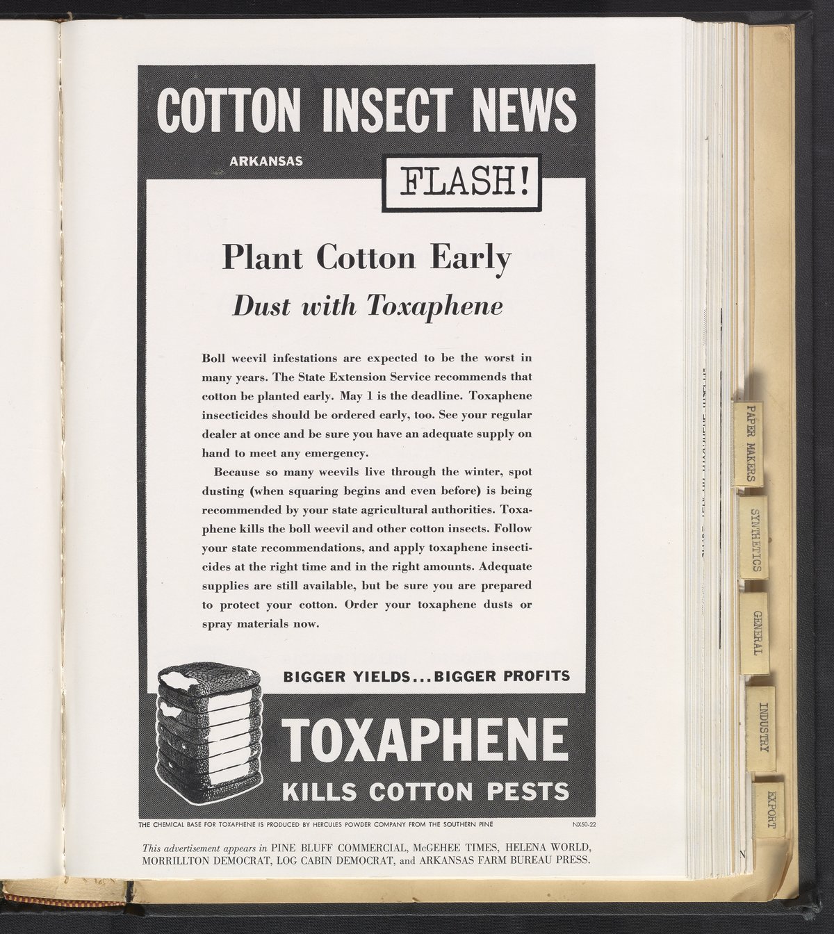 Print advertisement for toxaphene produced by Hercules Powder Company reads "Cotton Insect News Flash! Arkansas" with a bale of cotton alongside the toxaphene tagline that reads "kills cotton pests." Accompanying paragraph discusses the use of toxaphene to combat the year's predicted boll weevil infestations. This advertisement appeared in Pine Bluff Commercial, McGehee Times, Helena World, Morrillton Democrat, Log Cabin Democrat, and Arkansas Farm Bureau Press.