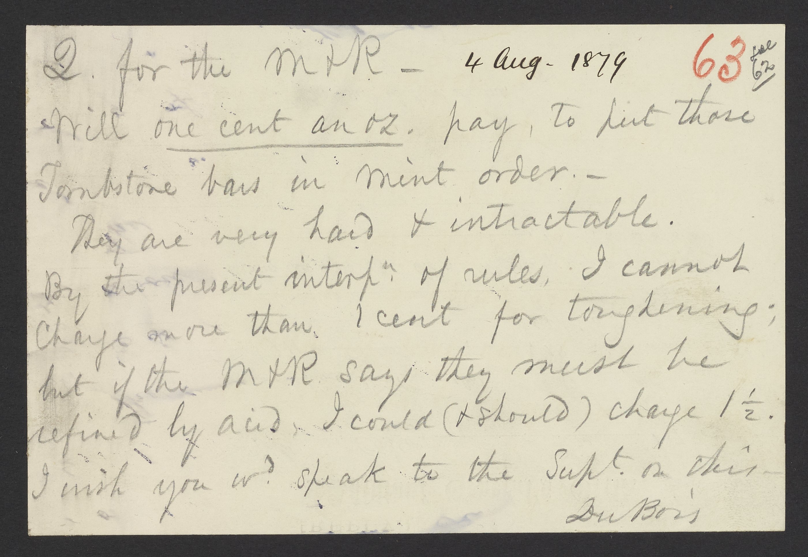 Brief note headed "Q for the M & R" written by William Ewing Du Bois (1810-1881), Assistant Assayer of the United States Mint. The note alerts James Curtis Booth (1810-1888) that the "toughening" of bars will cost more than the one cent per ounce allowed.