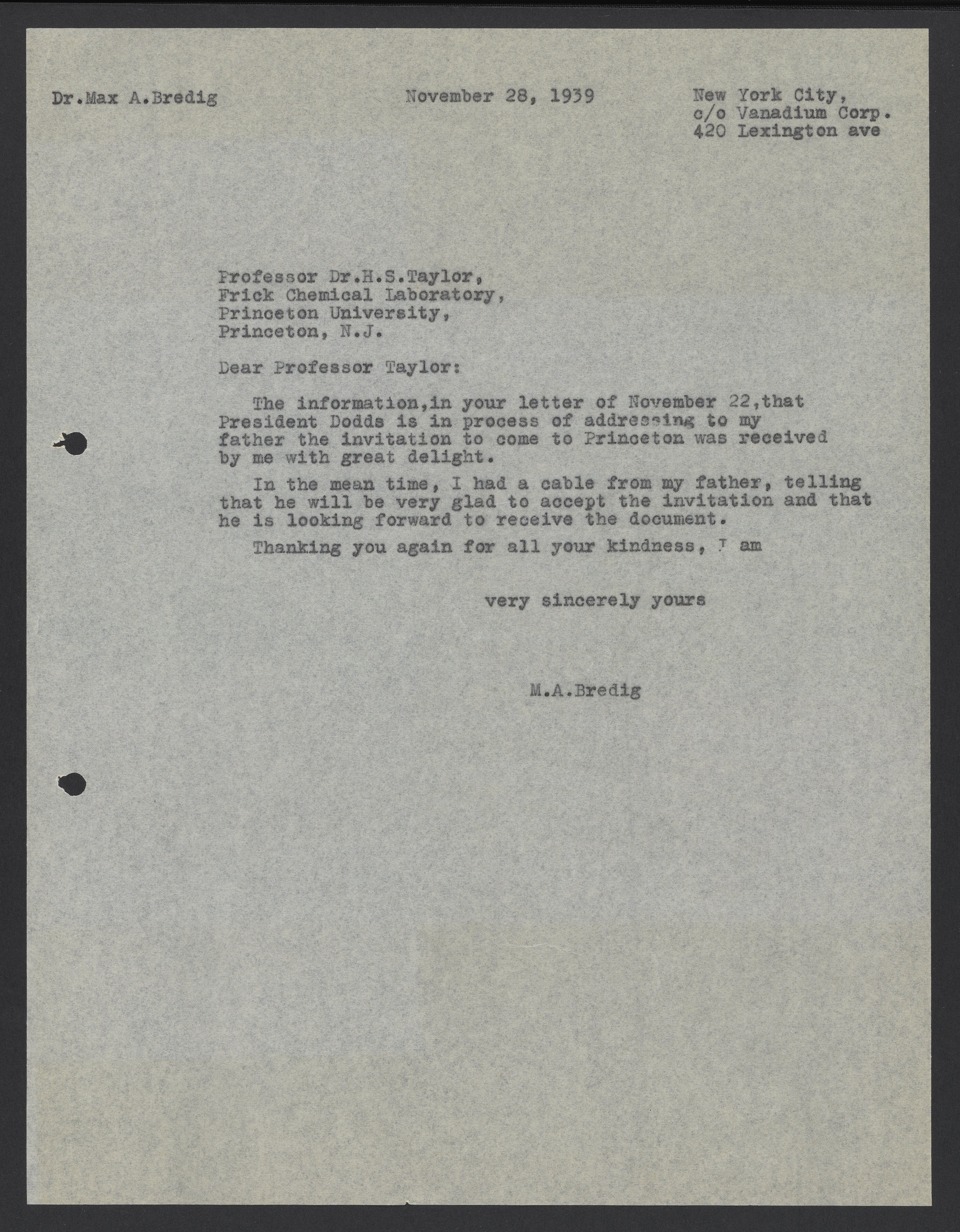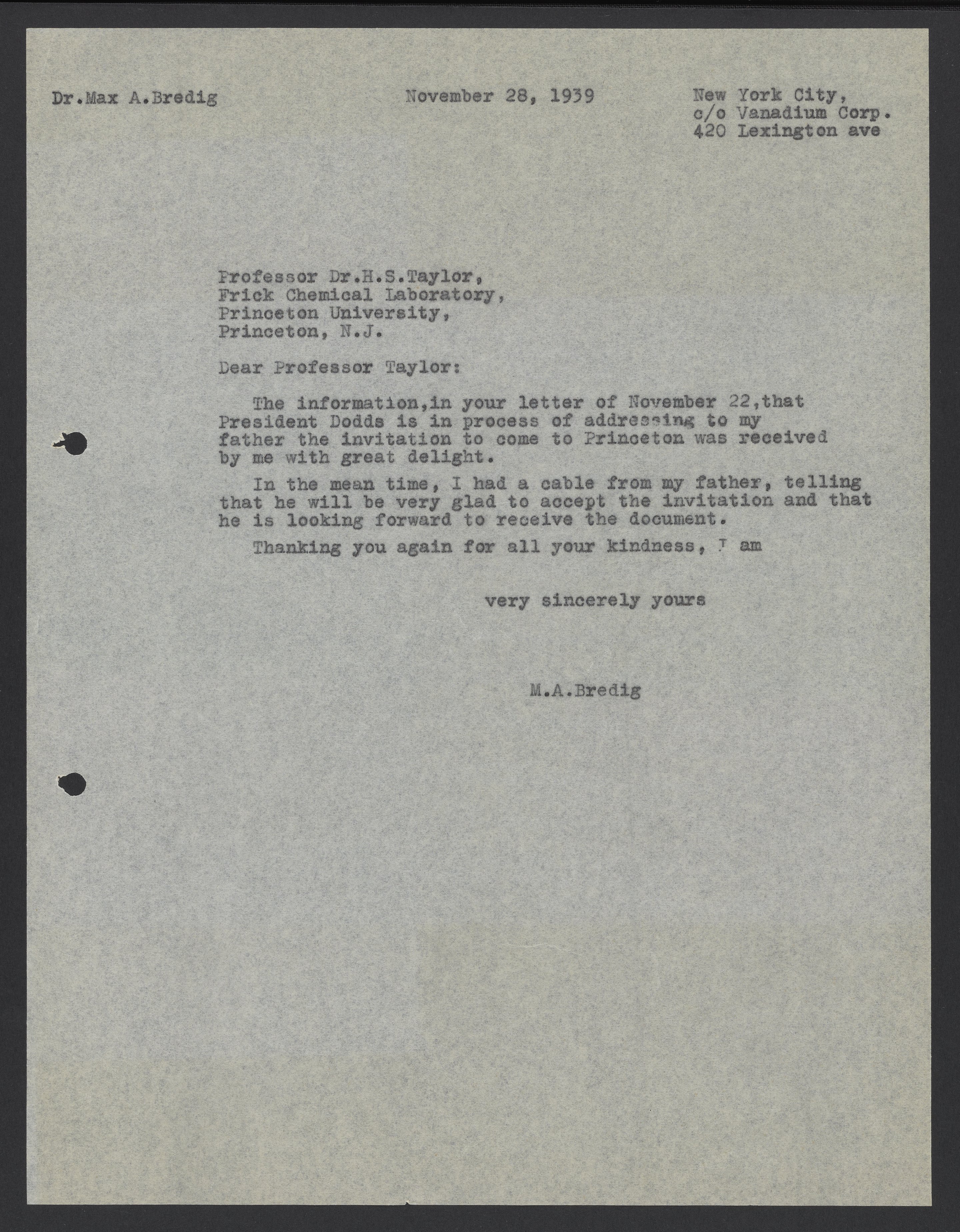 Letter from Max Bredig to Hugh S. Taylor, November 28, 1939