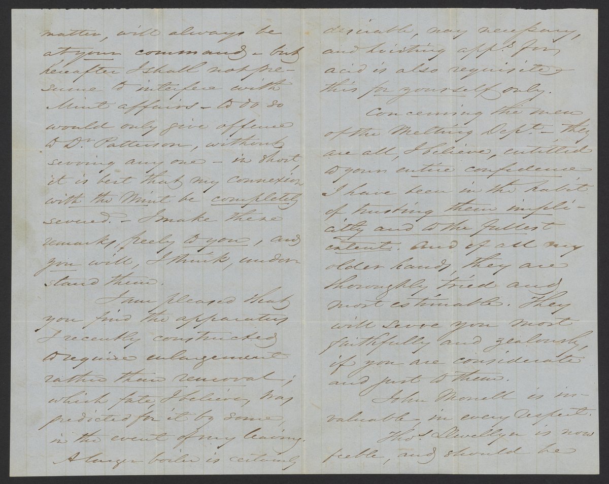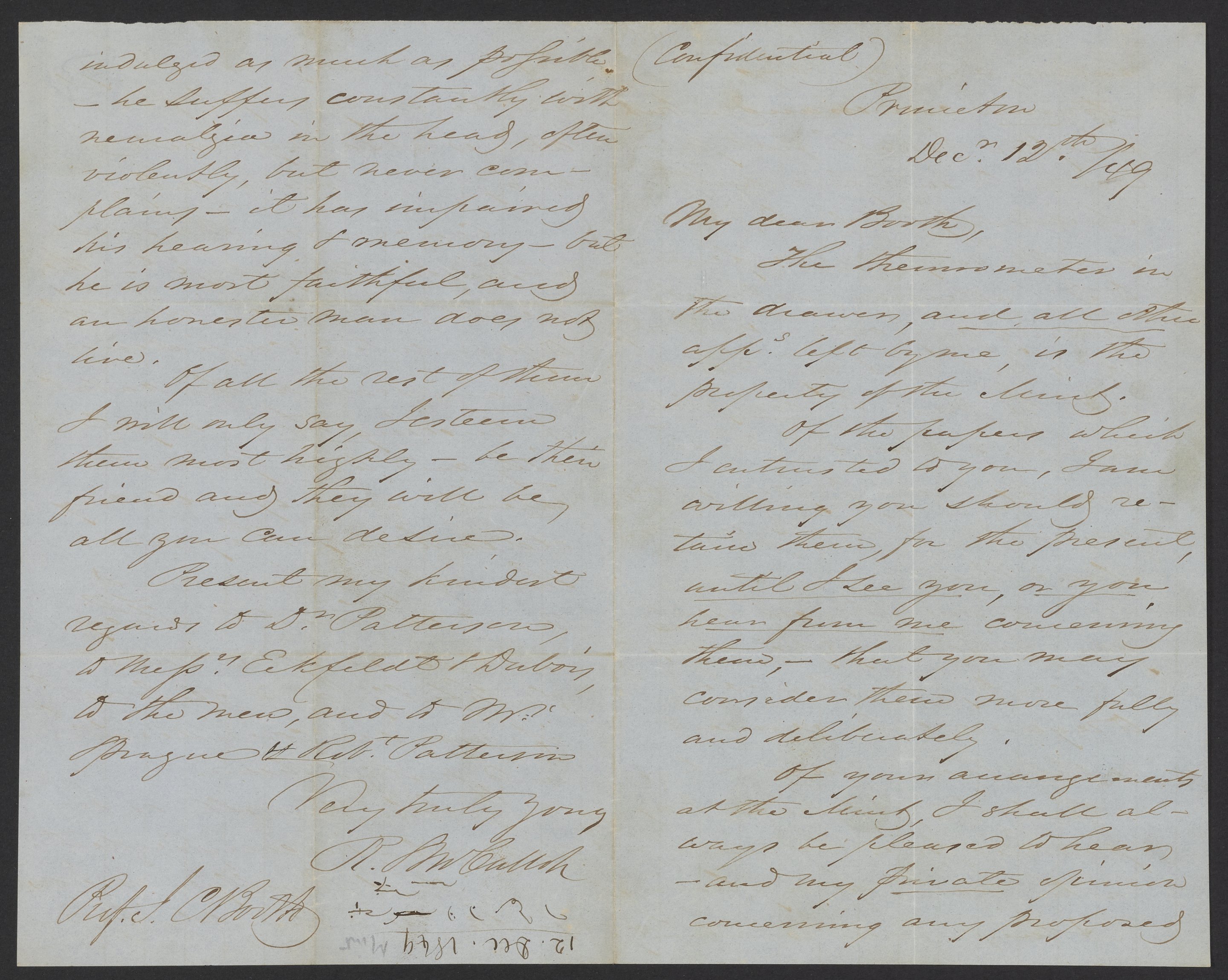 Small JPG1200 x 957px — 199 KBLarge JPG2880 x 2298px — 988 KBFull-sized JPG4052 x 3233px — 1.8 MBOriginal fileTIFF — 4052 x 3233px — 37.5 MBLetter marked "confidential" discussing business of the United States Mint. Richard S. McCulloh (1818-1894) studied chemistry in Philadelphia with James Curtis Booth (1810-1888) from 1838 to 1839. From 1846 to 1849 he worked for the U.S. Mint in Philadelphia.