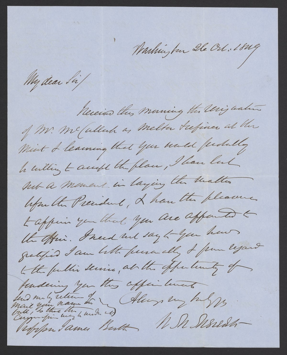 Letter from William M. Meredith to James Curtis Booth, October 26, 1869