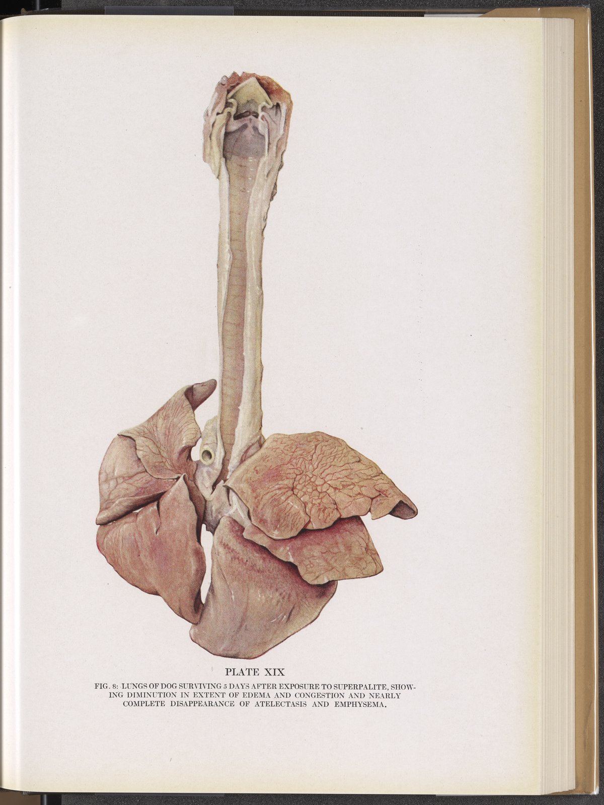 Plate XIX (Fig. 8): Lungs of dog surviving 5 days after exposure to superpalite, showing diminution in extent of edema and congestion and nearly complete disappearance of atelectasis and emphysema.