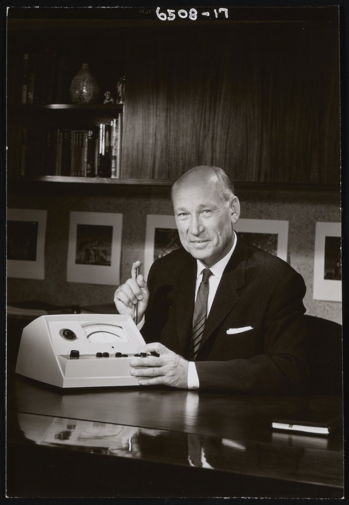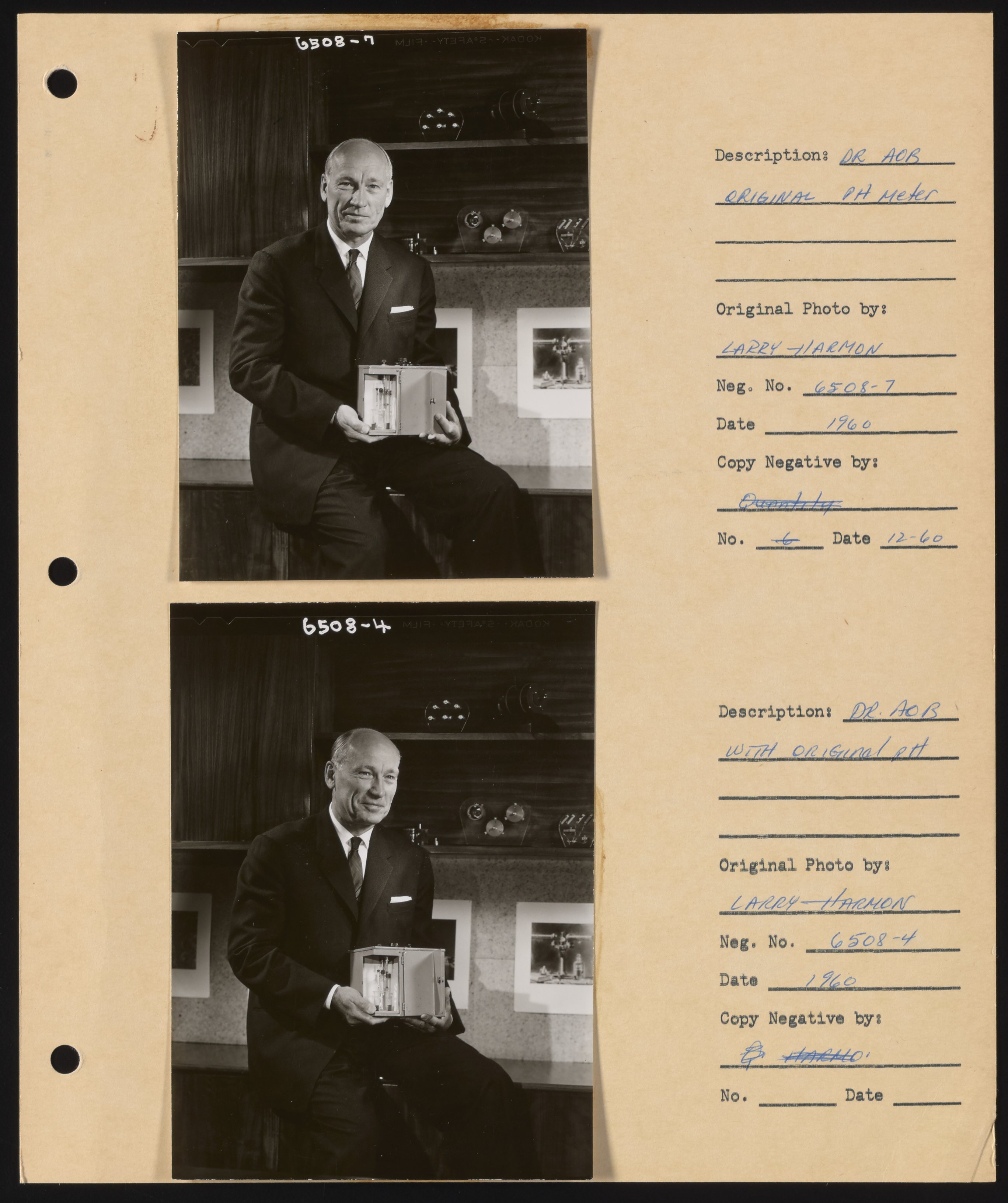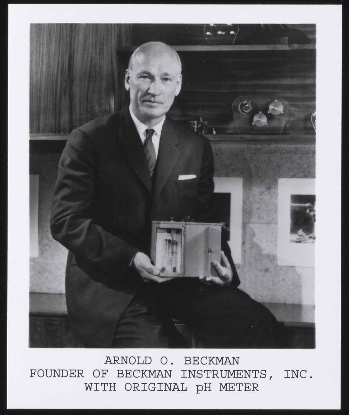 Small JPG1200 x 1427px — 152 KBFull-sized JPG1327 x 1578px — 175 KBOriginal fileTIFF — 1327 x 1578px — 6.1 MBDr. Arnold O. Beckman (1900-2004) invented the first commercially successful electric pH meter in 1934 and thus began a long career manufacturing scientific and medical instruments with National Technical Laboratories, Arnold O. Beckman, Inc., and Beckman Instruments. After his retirement he devoted his life to philanthropy and specifically supporting scientific innovation.