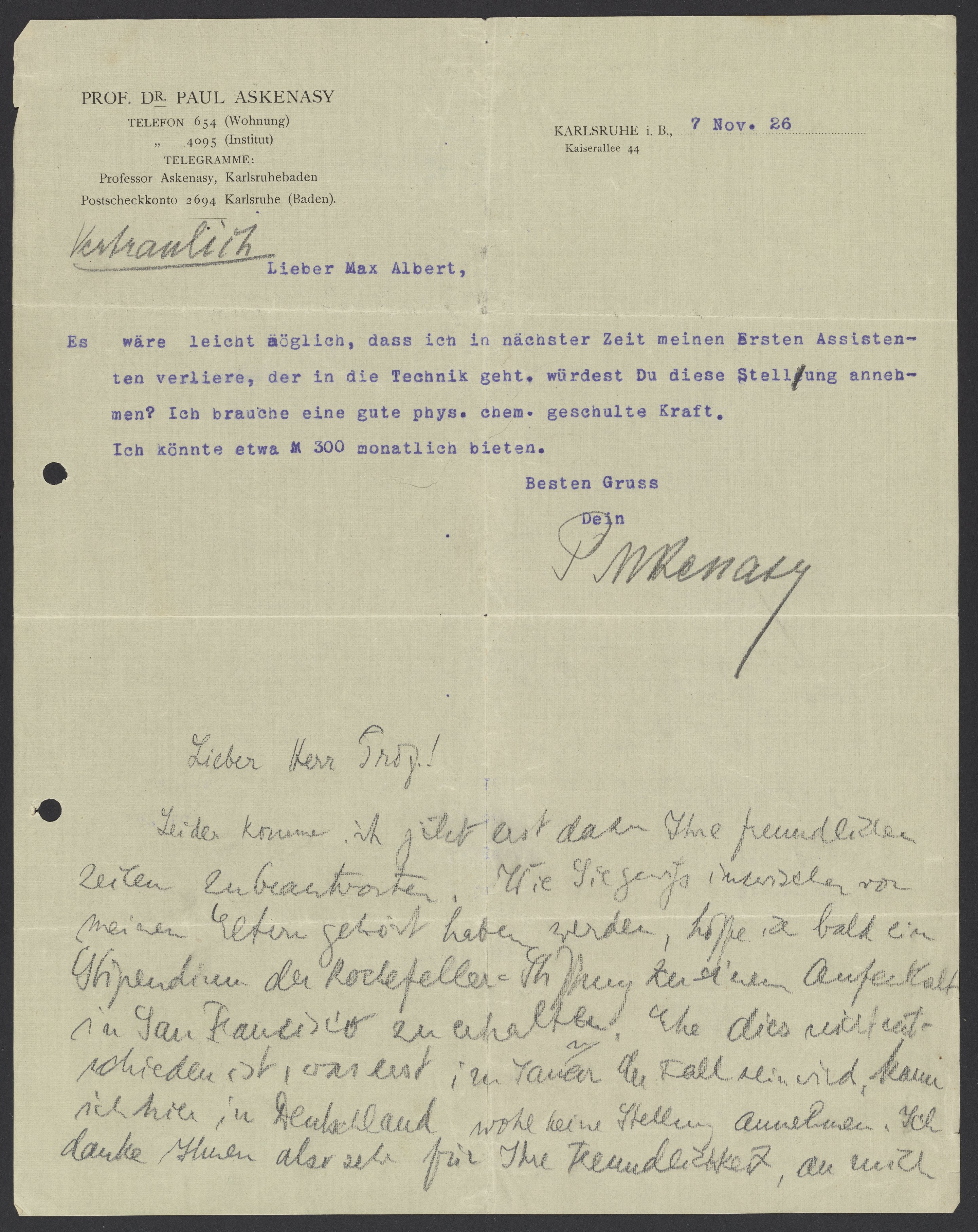 Paul Askenasy (1869-1938) offers a job to Max Albert Bredig (1902-1977) as his assistant. Below the letter in pencil Max declines the offer saying he is hoping to receive a grant soon from the Rockefeller Foundation to work in San Francisco.