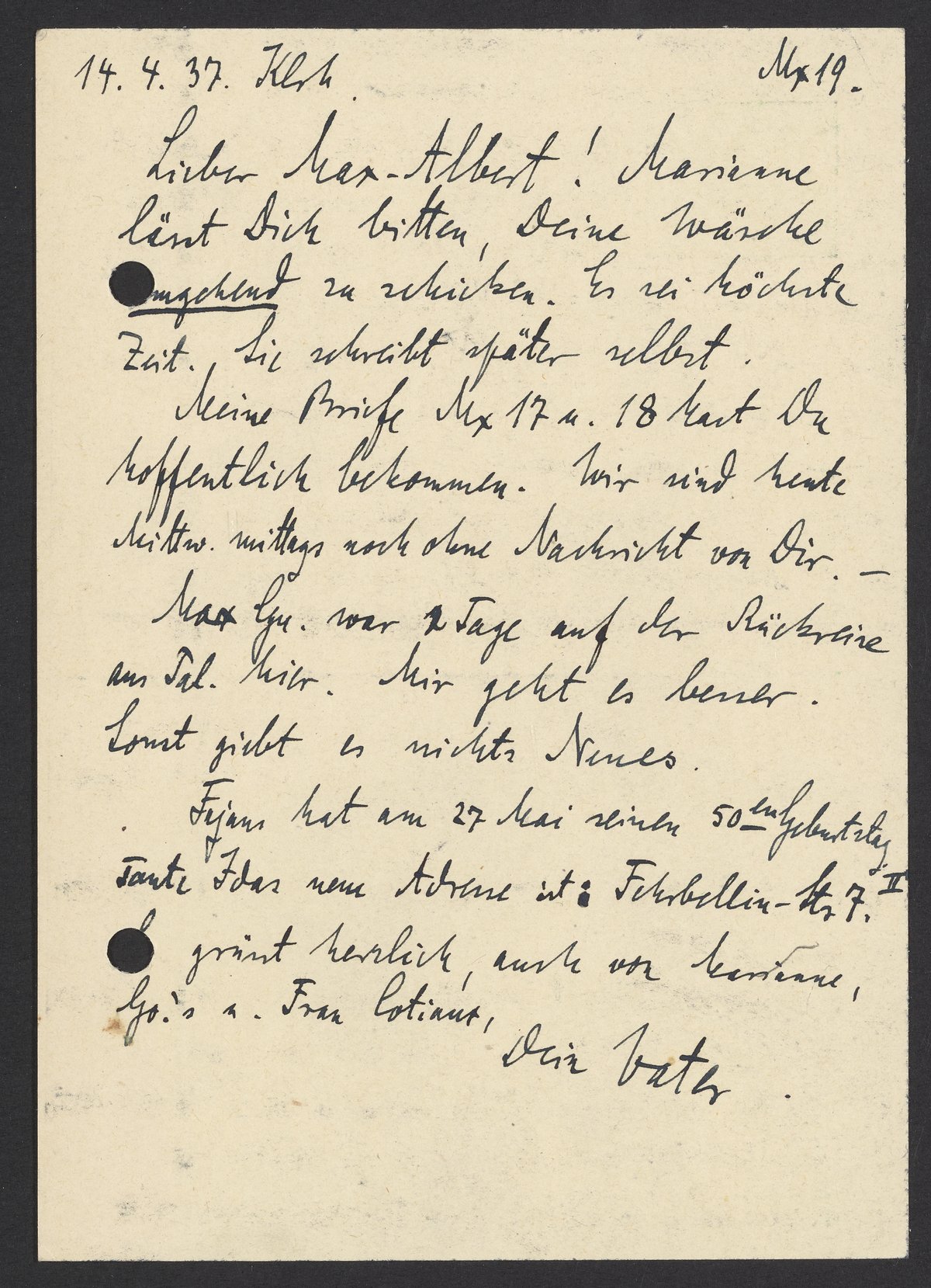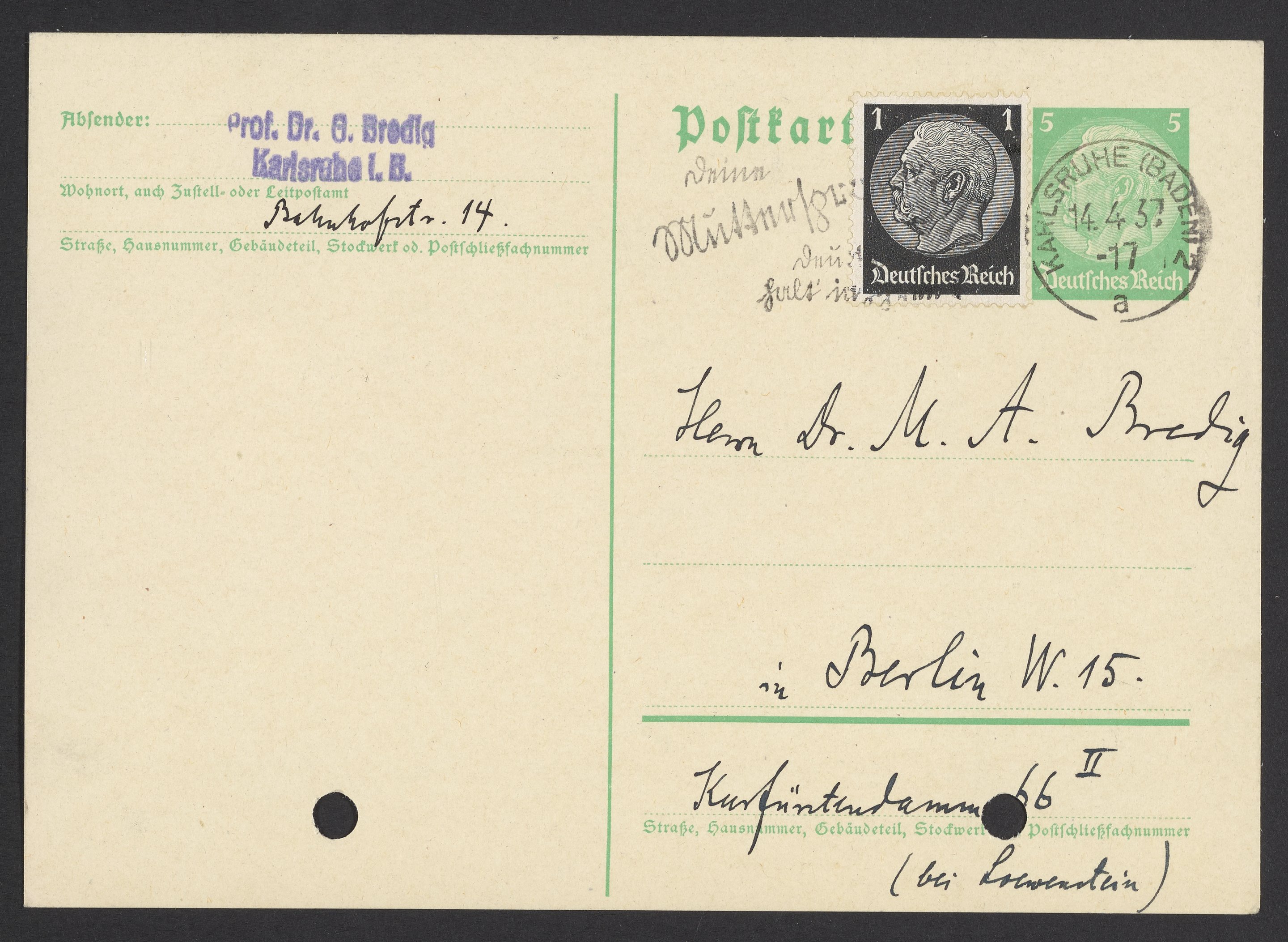 Postcard from Georg Bredig to Max Bredig, April 14, 1937