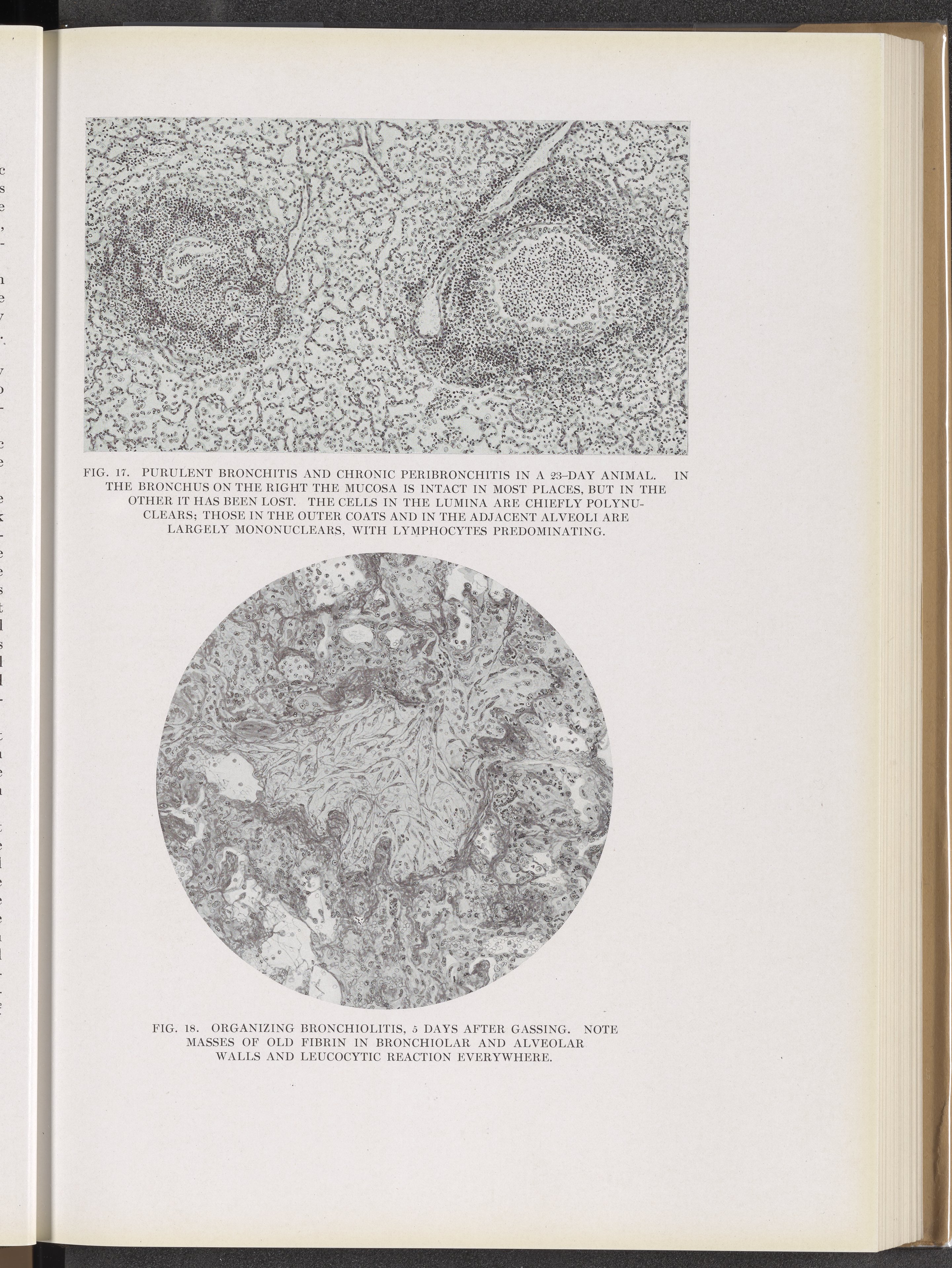 Winternitz, M. C. (Milton C.). “Fig. 17: Purulent Bronchitis and Chronic Peribronchitis in a 23-Day Animal. Fig. 18: Organizing Bronchiolitis, 5 Days after Gassing.” Collected Studies on the Pathology of War Gas Poisoning. New Haven, Connecticut: Yale University Press, 1920. https://digital.sciencehistory.org/works/wp988j973.