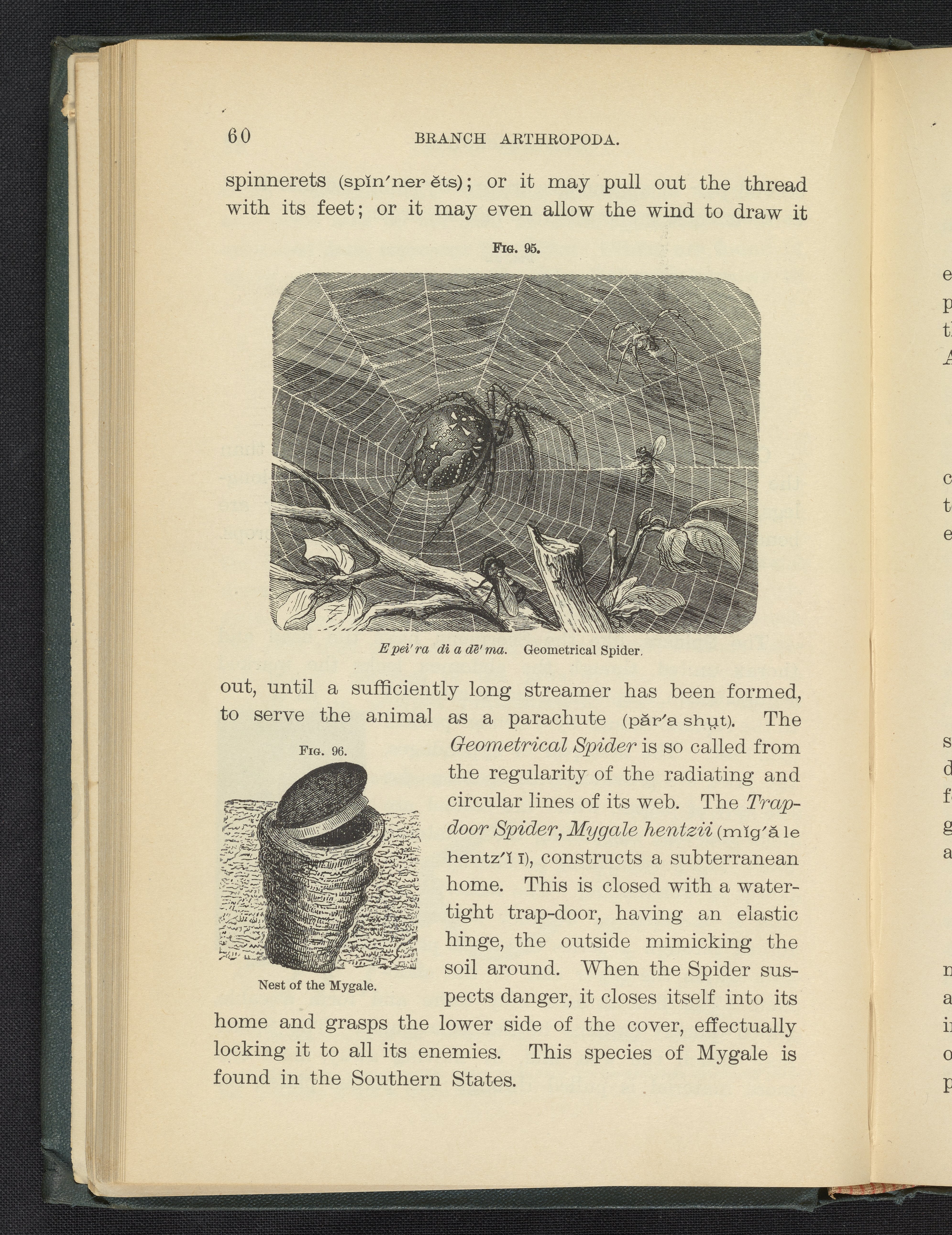 Steele, Joel Dorman, and Jenks, J. W. P. (John Whipple Potter). “Figure 95. Geometrical Spider. Figure 96. Nest of the Mygale.” Popular Zoology. New York, New York: Chautauqua Press, 1887. https://digital.sciencehistory.org/works/wplmck3.