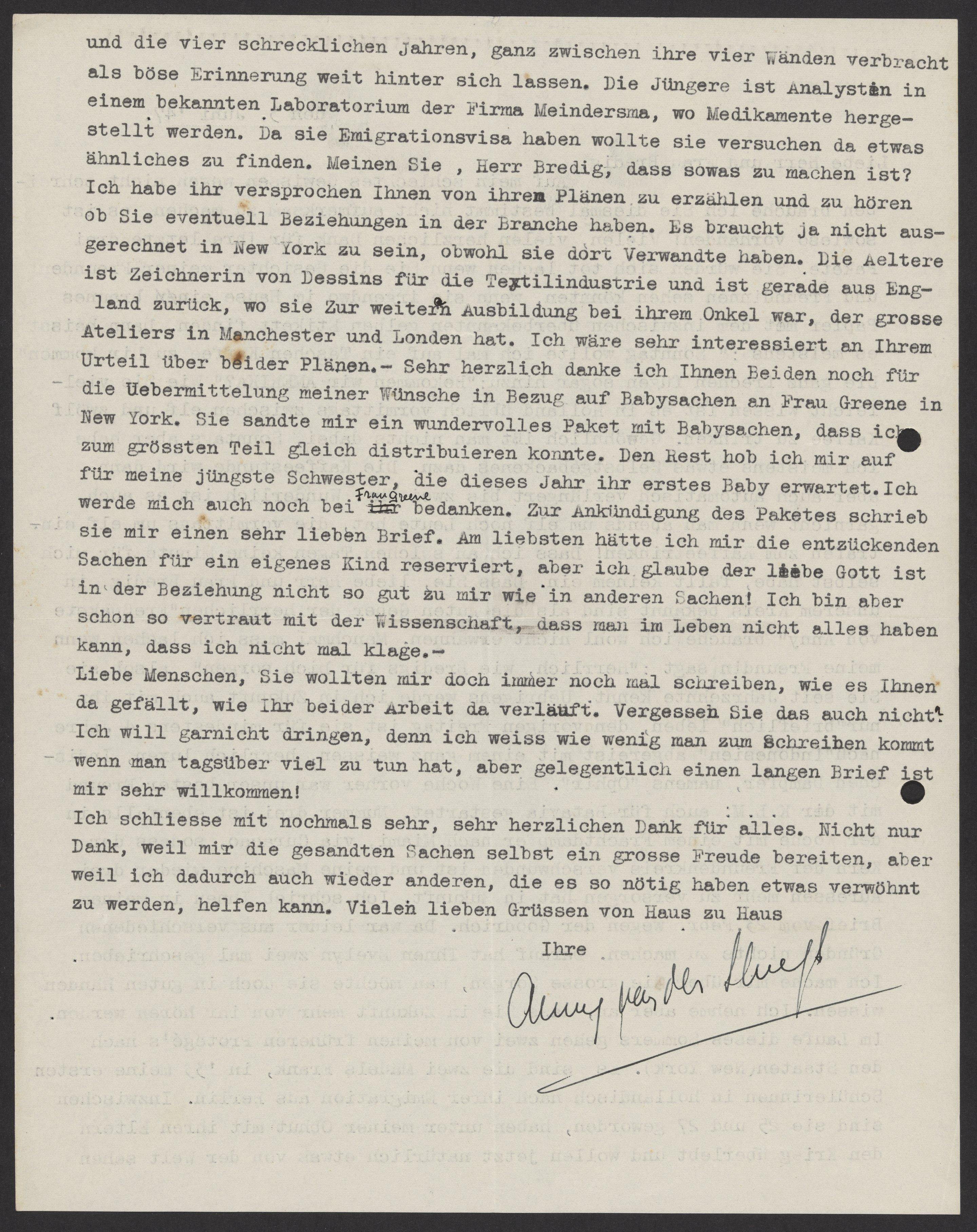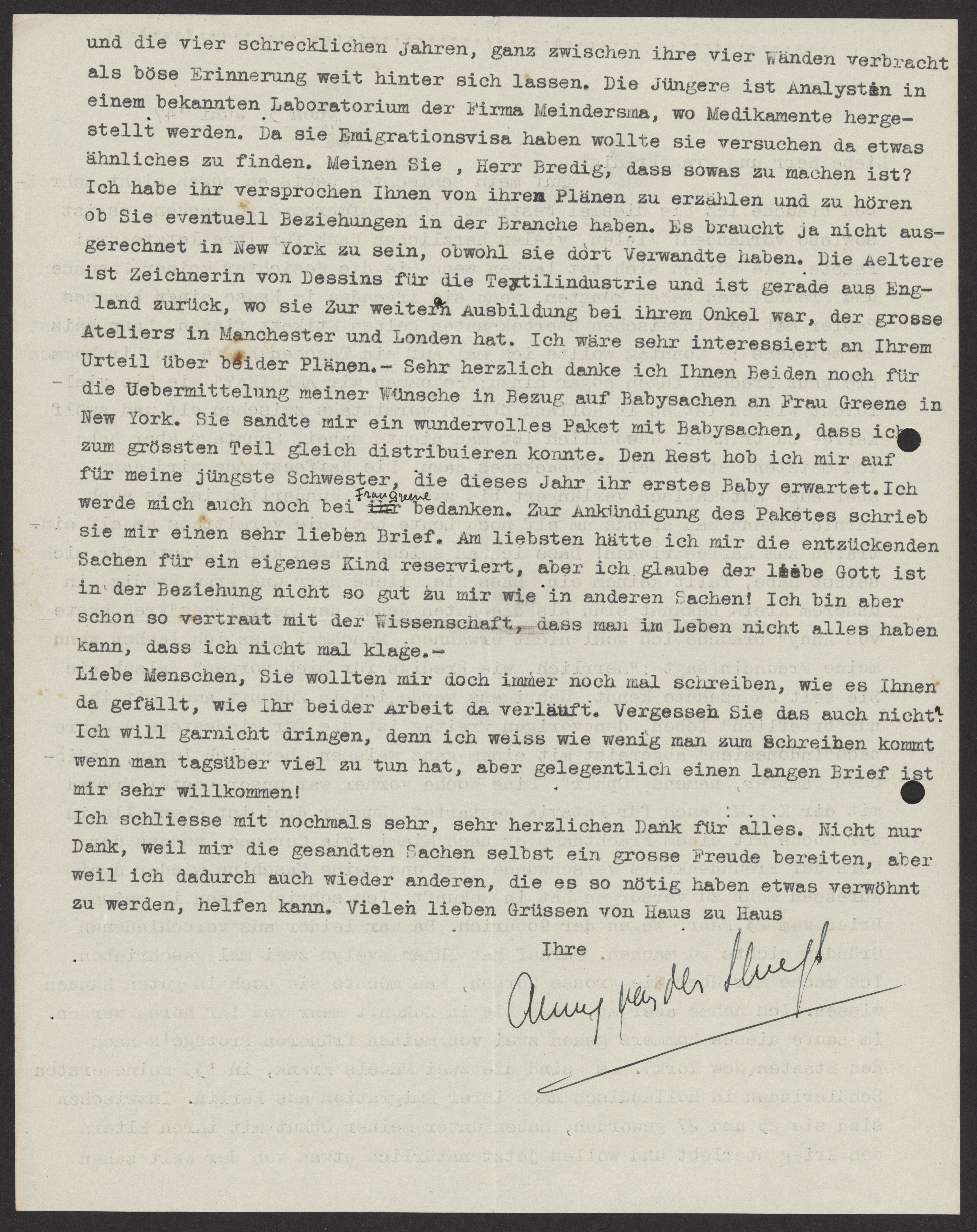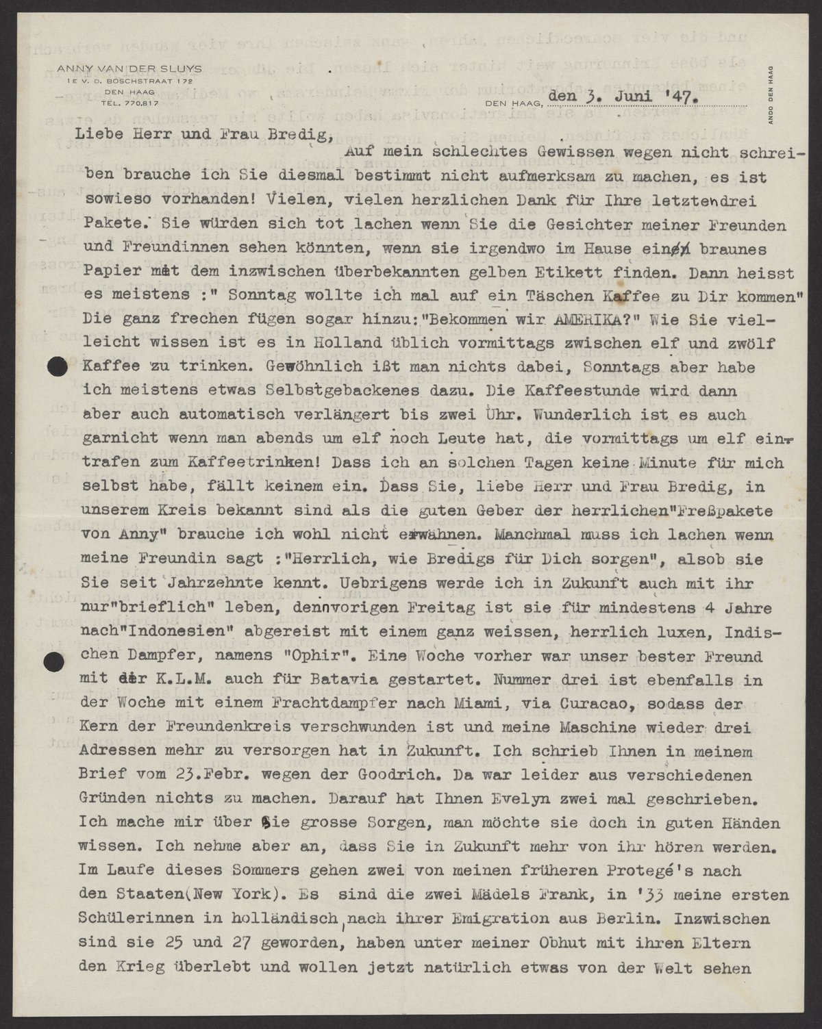 Letter from Anny van der Sluys to Lydia and Max Bredig, June 3, 1947
