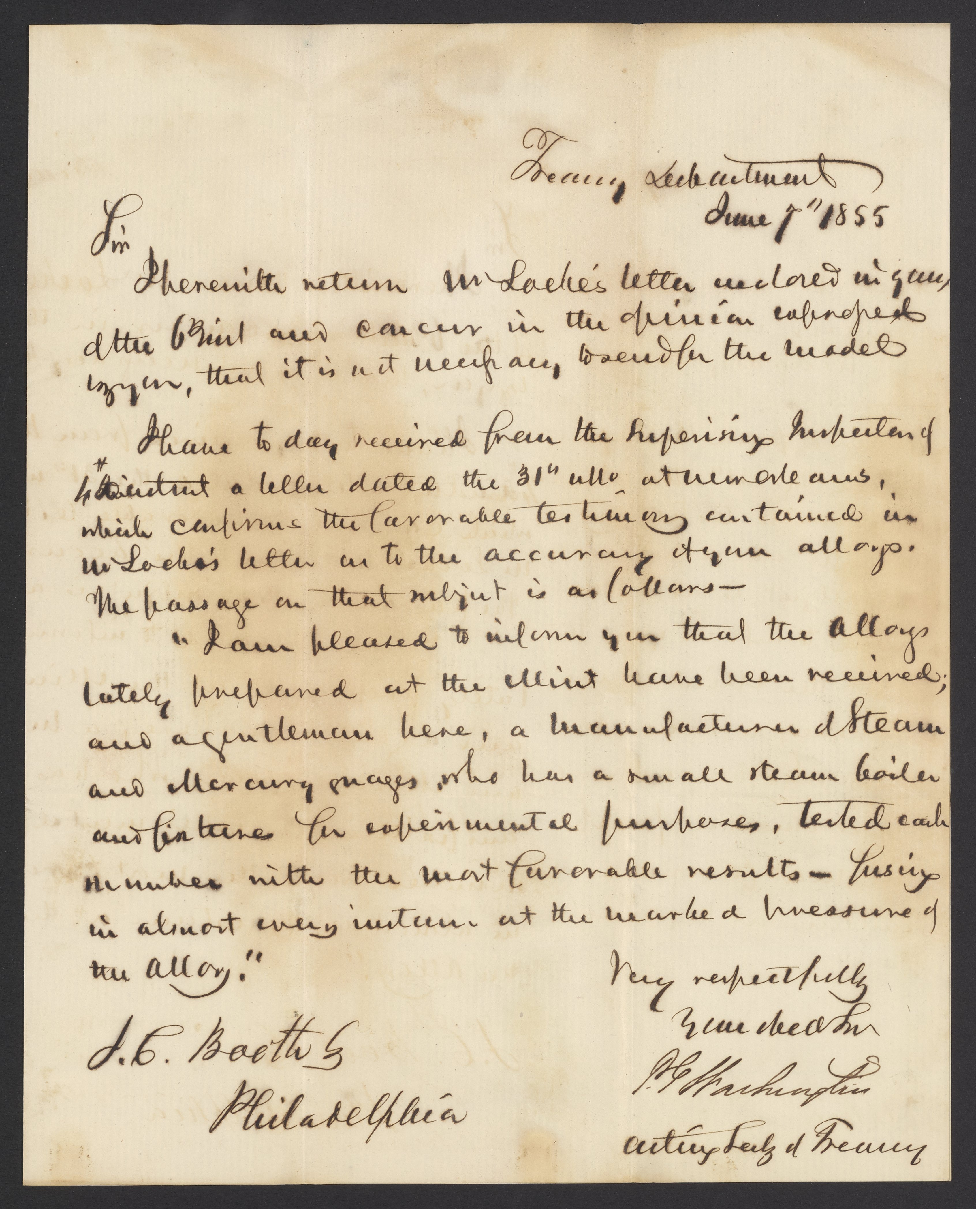 Small JPG1200 x 1486px — 266 KBLarge JPG2880 x 3566px — 1.2 MBFull-sized JPG3385 x 4191px — 1.7 MBOriginal fileTIFF — 3385 x 4191px — 40.7 MBJ. G. Washington, of the United States Treasury Department, writes to James Curtis Booth (1810-1888) to discuss a successful test of Booth's alloys.