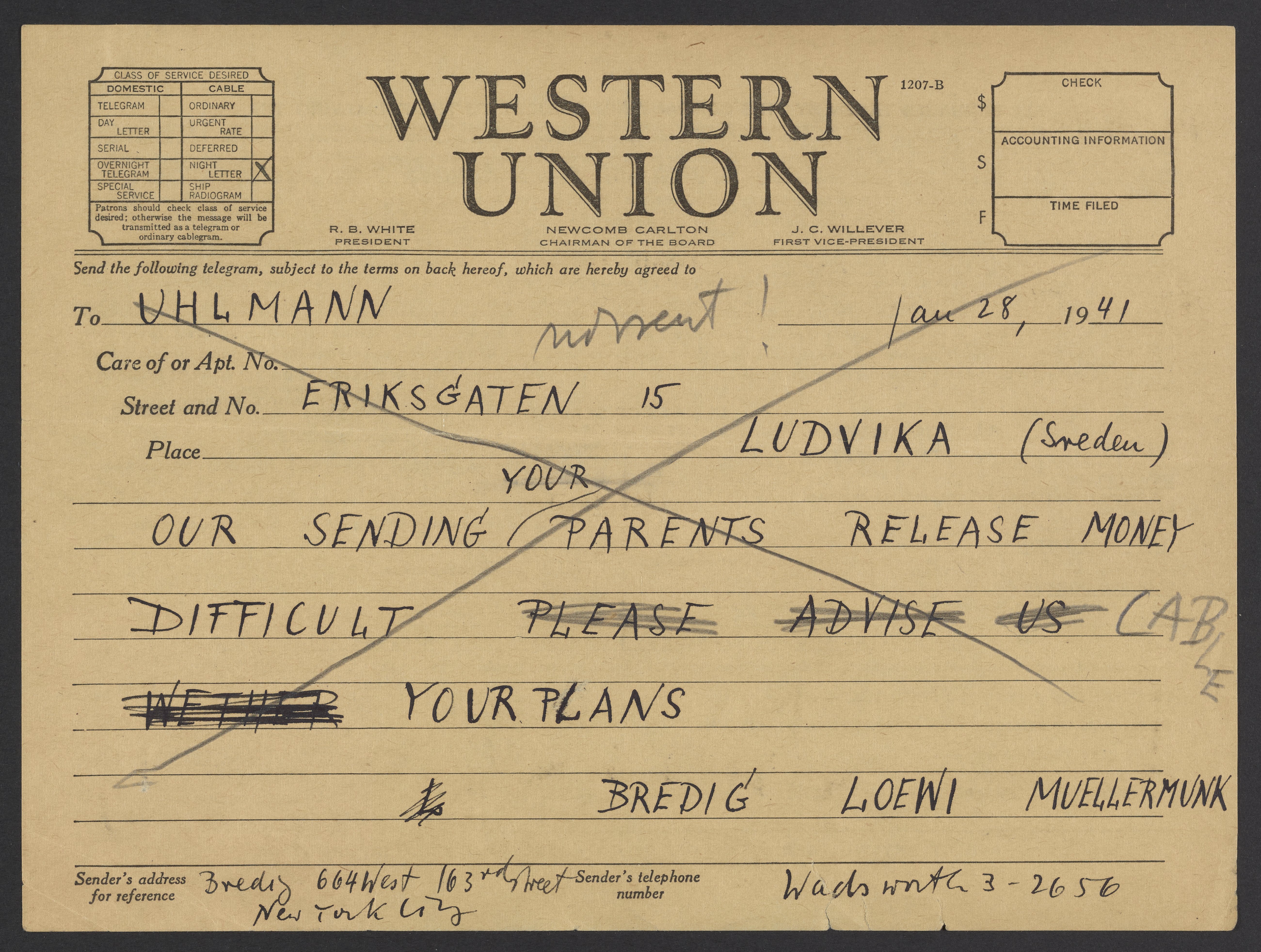 Bredig, Max Albert. “Telegram from Max Bredig to Uhlmann,” January 28, 1941. Papers of Georg and Max Bredig, Box 8, Folder 38. Science History Institute. Philadelphia. https://digital.sciencehistory.org/works/wrqdrmq.