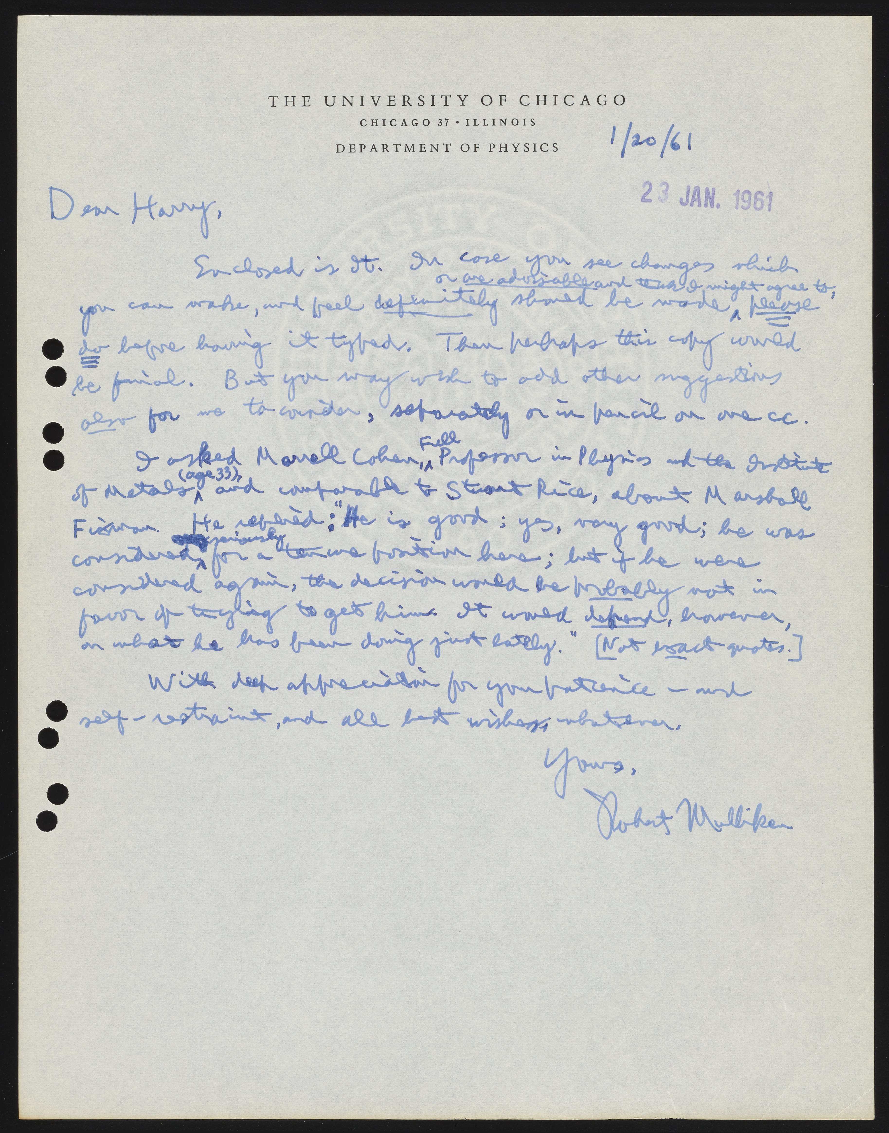 Letter from Robert S. Mulliken to Harrison Shull, 1961
