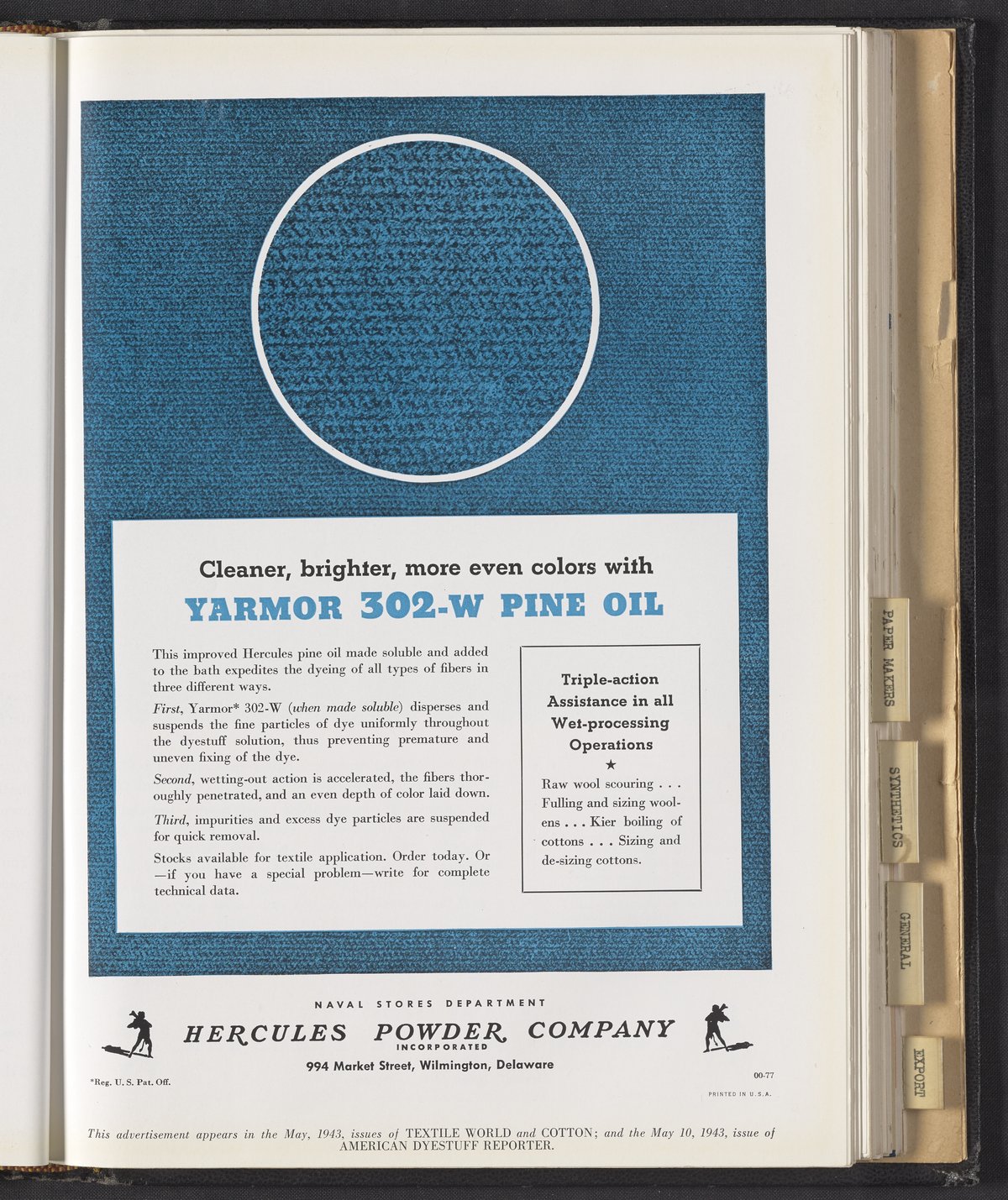 Hercules Incorporated. “Cleaner, Brighter, More Even Colors with Yarmor 302-W Pine Oil.” 1943 Hercules Advertisements, 1943. Records of Hercules Incorporated, Volume 1943. Science History Institute. Philadelphia. https://digital.sciencehistory.org/works/ws859g437.