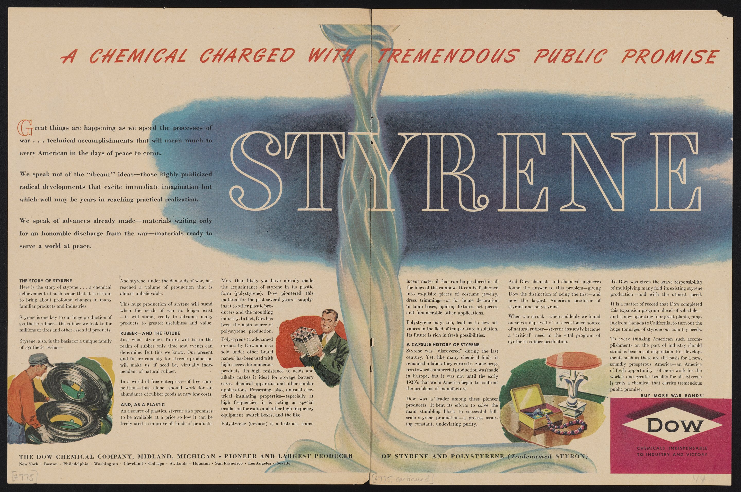 Two-page color advertisement for styrene, a chemical compound that is the basis of polystyrene. Dow polystyrene was marketed under the trade name Styron for a variety of commercial and industrial uses. The advertisement features a stylized ribbon of translucent plastic in the center, as well as small inset illustrations showing different applications of styrene. The accompanying text describes the development and uses of styrene in great detail. Notably, styrene was used in the production of synthetic rubber, which became crucial to the United States' war effort after the country no longer had access to natural rubber from Southeast Asia during World War II. The advertisement was produced during World War II and bears the Company's wartime tagline "Dow: Chemicals Indispensable to Industry and Victory."