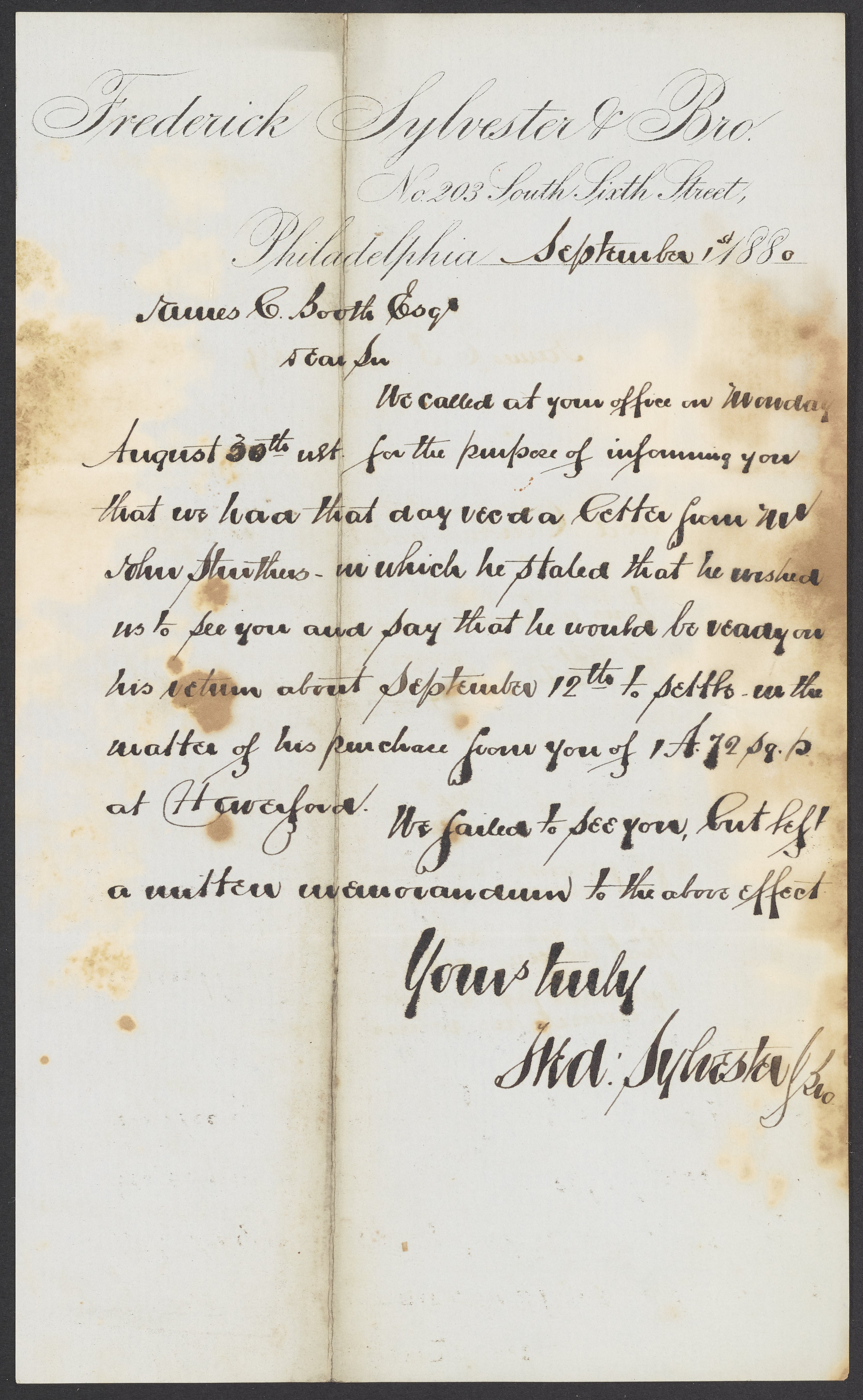 Letter from Frederick Sylvester & Brother to James Curtis Booth, September 1, 1880