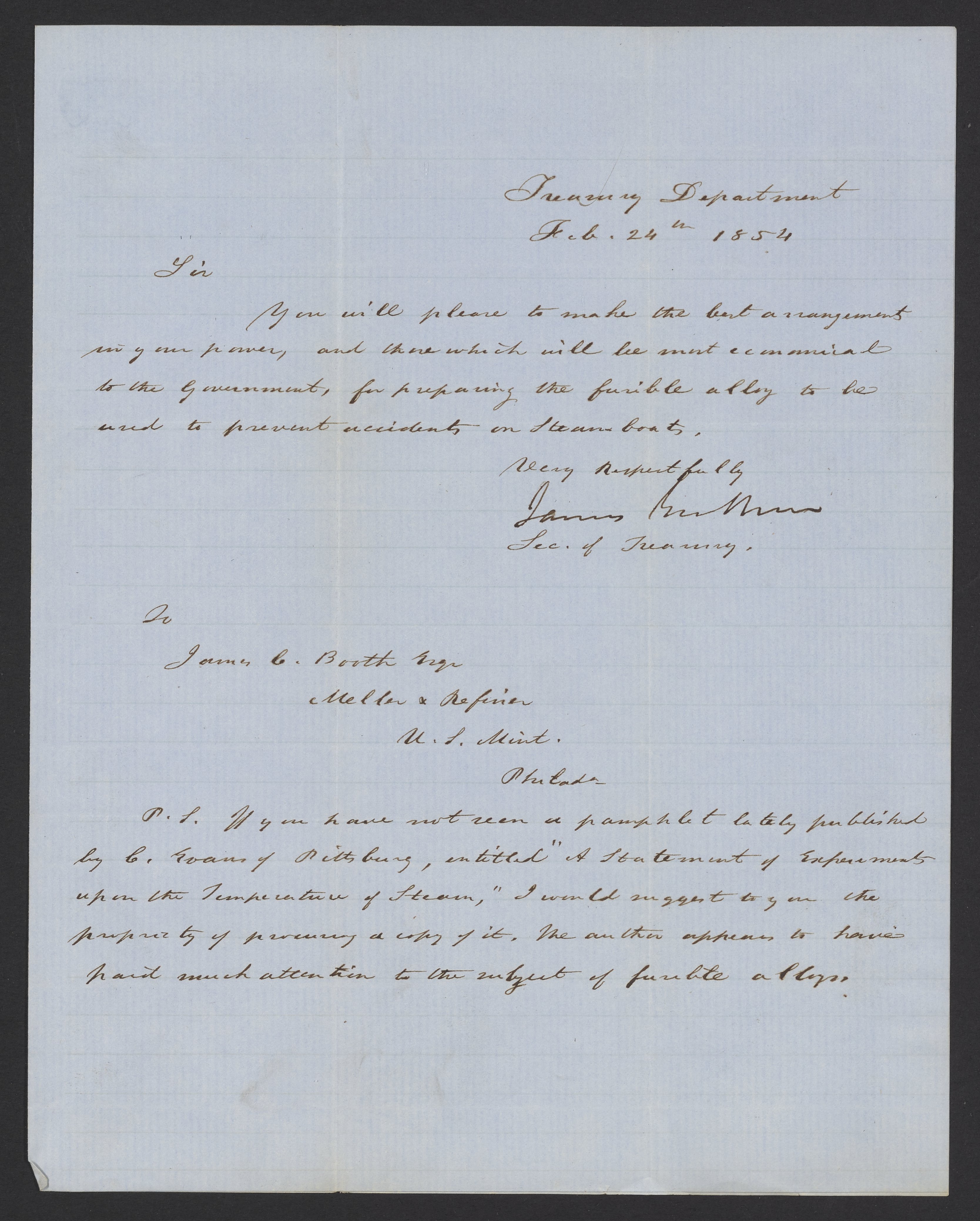 Letter from James B. Guthrie to James Curtis Booth, February 24, 1854