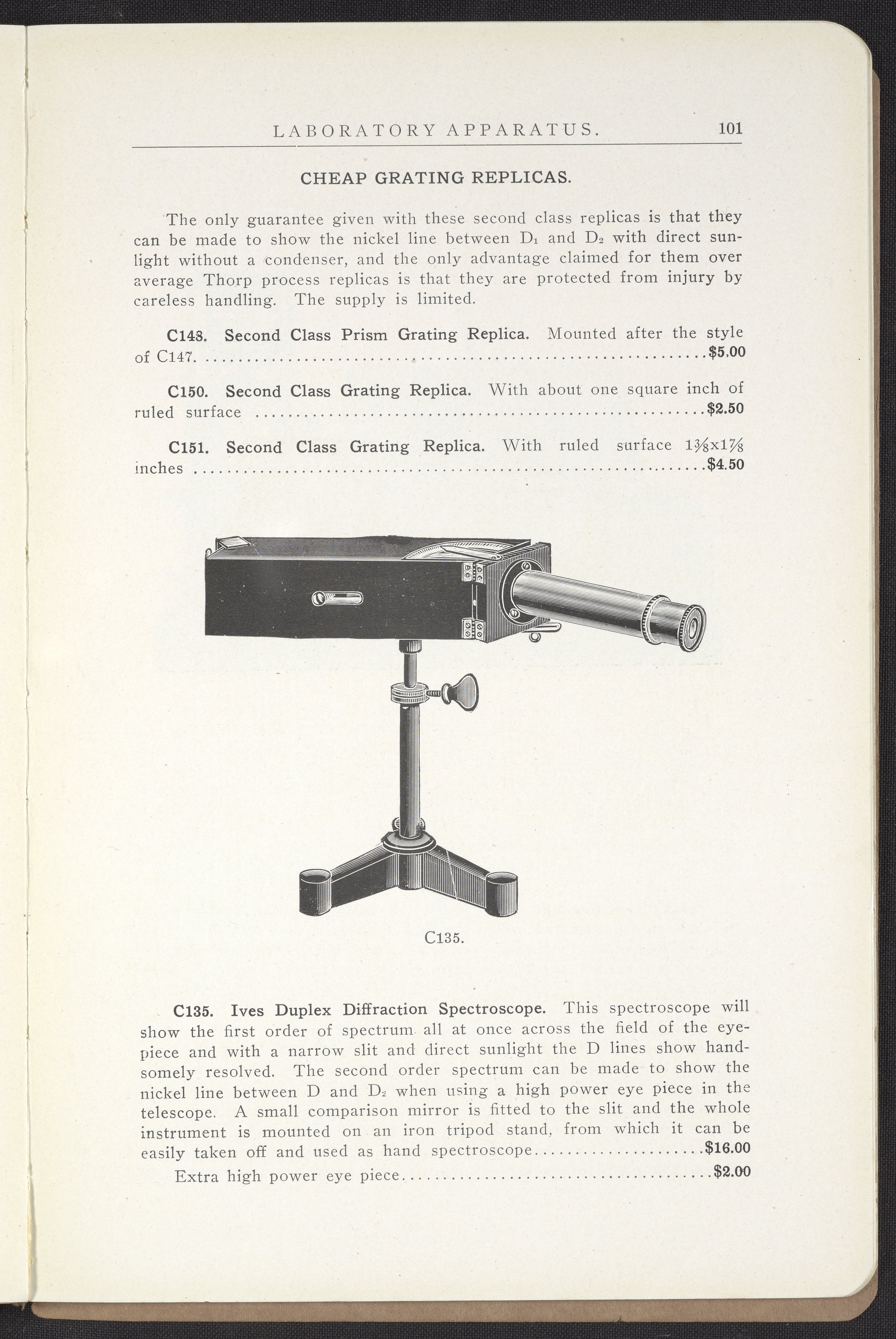 Wm. Gaertner & Company. “Ives Duplex Diffraction Spectroscope.” Instruments of Precision Laboratory Apparatus, M-L Catalog. Chicago, Illinois, 1911. https://digital.sciencehistory.org/works/ww72bb49x.