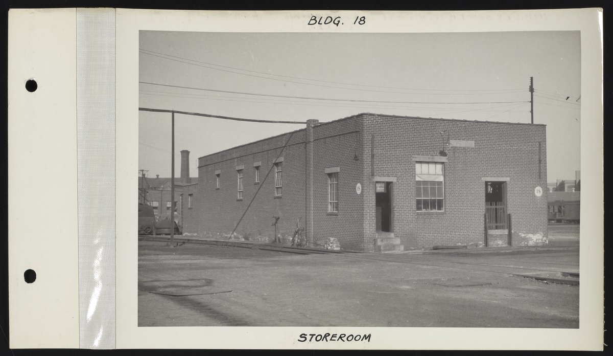 Exterior view of the storeroom (Building 18) at the Charles Lennig and Company chemical manufacturing plant in Bridesburg, a neighborhood located along the Delaware River in the Northeast section of Philadelphia, Pennsylvania. Charles Lennig and Company operated as a subsidiary of the Rohm and Haas Company, an international chemical company headquartered in Philadelphia, from 1920 to 1947.