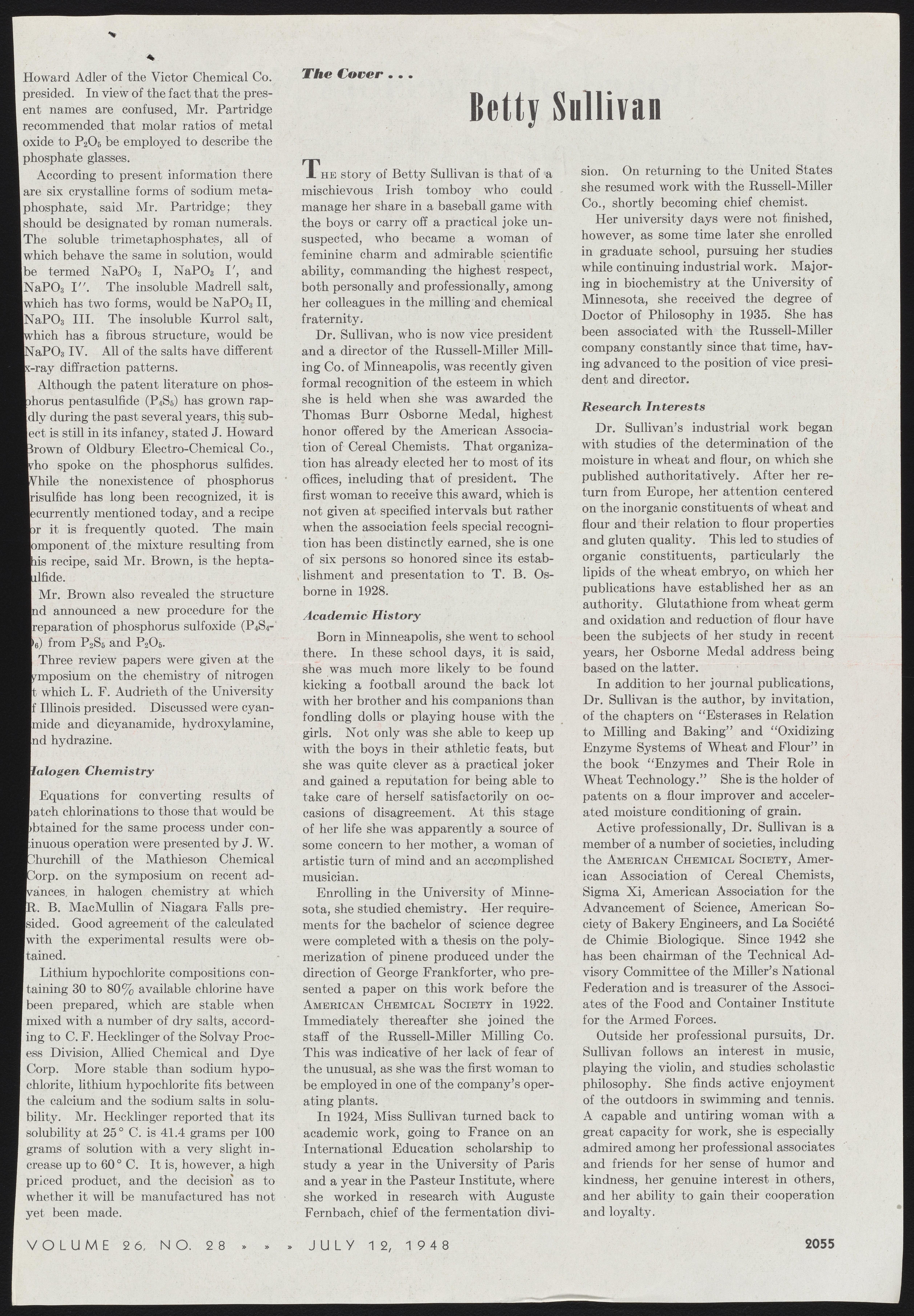 Small JPG1200 x 1661px — 450 KBLarge JPG2880 x 3986px — 3.3 MBFull-sized JPG5315 x 7357px — 10.2 MBOriginal fileTIFF — 5315 x 7357px — 112 MBTwo-page article from the July 12, 1948 edition of Chemical and Engineering News profiling Dr. Betty J. Sullivan (1902-1999).