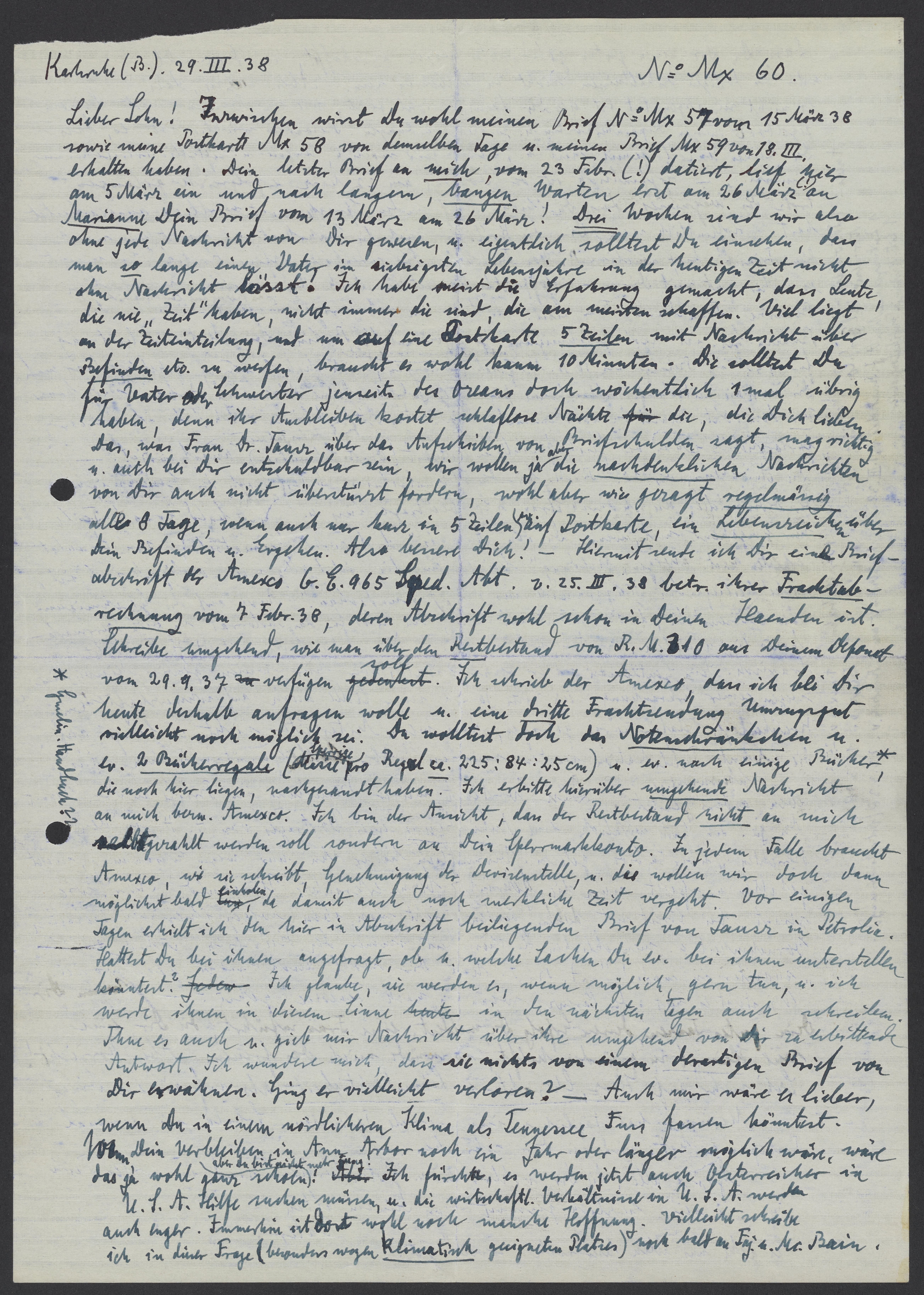 Lieber Sohn! Inzwischen wirst Du wohl meinen Brief No Mx 57 vom 15 März 38 sowie meine Postkarte Mx 58 von demselben Tage u. meinen Brief Mx 59 von 18.III erhalten haben. Dein letzter Brief an mich, vom 23 Febr. (!) datiert, lief hier am 5. März ein und nach langen, langen Warten erst am 26 Maerz an Marianne Dein Brief vom von 13 März an 26 März! Drei Wochen sind wir ohne jede Nachricht von Dir gewesen, u. eigentlich solltest Du einsehen, dass man so lange einen Vater im siebzigsten Lebensjahre in der heutigen Zeit nicht ohne Nachricht lässt! Ich habe meist die Erfahrung gemacht, dass Leute, die „Zeit“ haben, nicht immer die sind, die am meisten schaffen. Viel liegt an der Zeiteinteilung, und um eine Postkarte 5 Zeilen mit Nachricht über Befinden zu werfen, braucht es wohl kaum 10 Minuten. Die solltest Du für Vater und Schwester jenseits des Ozeans doch wöchentlich 1 mal übrig haben, denn ihr Ausbleiben kostet schlaflose Nächte für die, die Dich lieben. Das, war Frau Dr. Tausz über das Aufschreiben von Briefschulden sagt, mag richtig u. auch bei Dir entschuldbar sein, wir wollen ja aber die nachdenklicher Nachrichten von Dir auch nicht überstürzt fördern, wohl aber wie gesagt regelmässig alle 8 Tage, wenn auch nur kurz in 5 Zeilen u. auf Postkarte, ein Lebenszeichen über Dein Befinden u. Ergeben. Also bessere Dich! – Hiermit sende ich Dir einen Briefabschrift der Amexco G.E. 965 Sped. Abt. v. 25.III.38 betr. ihrer Frachtabrechnung vom 7 Febr. 38, deren Abschrift wohl schon in Deinen Händen ist. Schreibe umgehend, wie man über den Restbestand von R.M. 810 aus Deinem Deponat vom 29.9.37 verfügen soll. Ich schreibe der Amexco, dass ich bei Dir heute deshalb anfragen wolle u. eine dritte Frachtsendung Umzugsgut vielleicht noch möglich sei. Du solltest doch das Notenschränkschen u. ev. 2 Bücherregale (sperrige Masse pro Regal ca. 225: 84: 25 cm) u. ev. nach einige Bücher,* die noch hier liegen, nachgesandt haben. Ich erbitte hierüber umgehende Nachricht am mich bezw. Amexco. Ich bin der Ansicht, dass der Restbestand nicht an mich gezahlt werden soll sondern an Dein Sperrmarkkonto. In jedem Falle braucht Amexco, wie sie schreibt, Genehmigung der Devisenstelle u. die wollen wir doch dann möglichst bald einholen, da damit auch noch merkliche Zeit vergeht. Vor einigen Tagen erhielt ich den hier in Abschrift beiliegenden Brief von Tausz in Petrolia. Hattest Du bei ihnen angefragt, ob u. welche Sachen Du ev. bei ihnen unterstellen könntest? Ich glaube, sie werden es, wenn möglich, gern tun, u. ich werde ihnen in diesem Sinne in den nächsten Tagen auch schreiben. Thue es auch u. gieb mir Nachricht über ihre umgehend von Dir zu erbittende Antwort. Ich wundere mich, dass sie nichts von einem derartigen Brief von Dir erwähnen. Ging er vielleicht verloren? – Auch mir wäre es lieber, wenn Du in einem nördlichen Klima als Tennessee Fuss fassen könntest. Wenn Dein Verbleiben in Ann Arbor noch ein Jahr oder länger möglich wäre, wäre das ja wohl ganz schön! Ich fürchte, es werden jetzt auch Österreicher in U.S.A. Hilfe suchen müssen, ev. die wirtschaftl. Verhältnisse in U.S.A. werden auch enger. Immerhin ist dort wohl noch manche Hoffnung. Vielleicht schreibe ich in dieser Frage (besonders wegen klimatisch geeigneten Platzes) noch bald an Faj. u. McBain