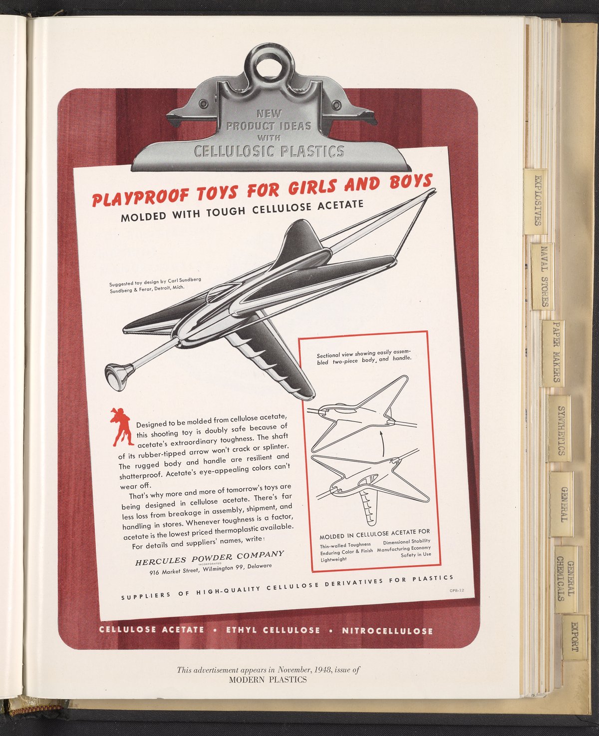 Hercules Incorporated. “Playproof Toys for Girls and Boys Molded with Tough Cellulose Acetate.” 1948 Hercules Advertisements, 1948. Records of Hercules Incorporated, Volume 1948. Science History Institute. Philadelphia. https://digital.sciencehistory.org/works/wzya2qu.