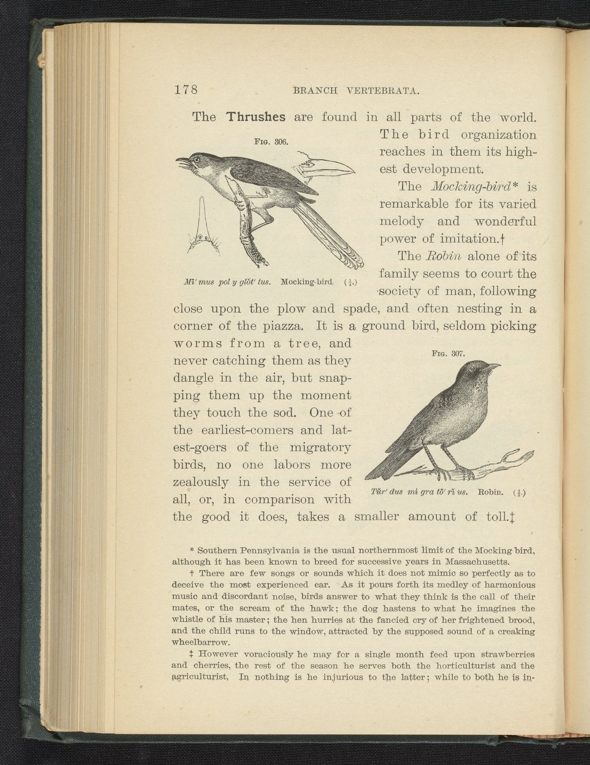 Steele, Joel Dorman, and Jenks, J. W. P. (John Whipple Potter). “Figure 306. Mocking-Bird. Figure 307. Robin.” Popular Zoology. New York, New York: Chautauqua Press, 1887. https://digital.sciencehistory.org/works/x0qyqqv.