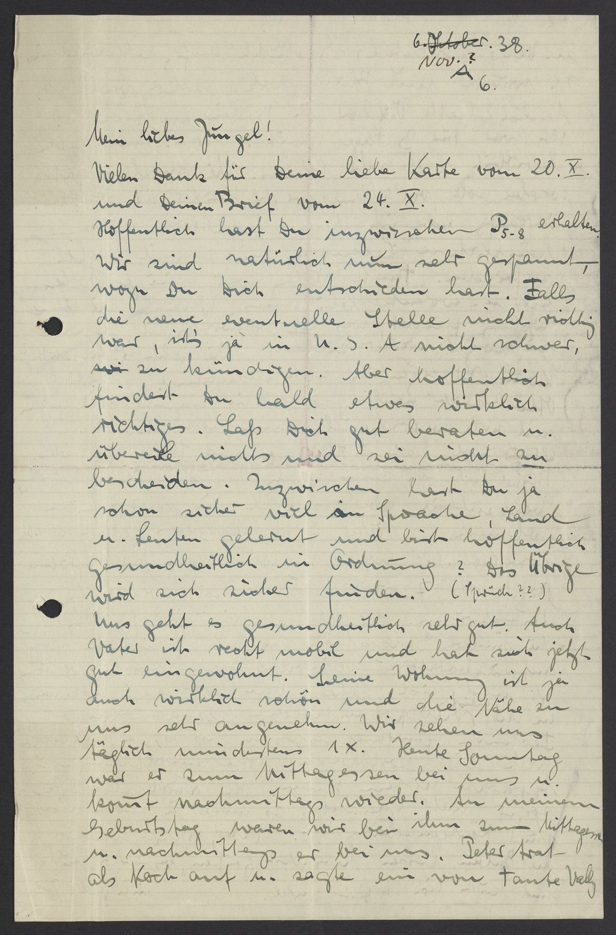 Letter from Marianne Homburger to Max Bredig, November 6, 1938