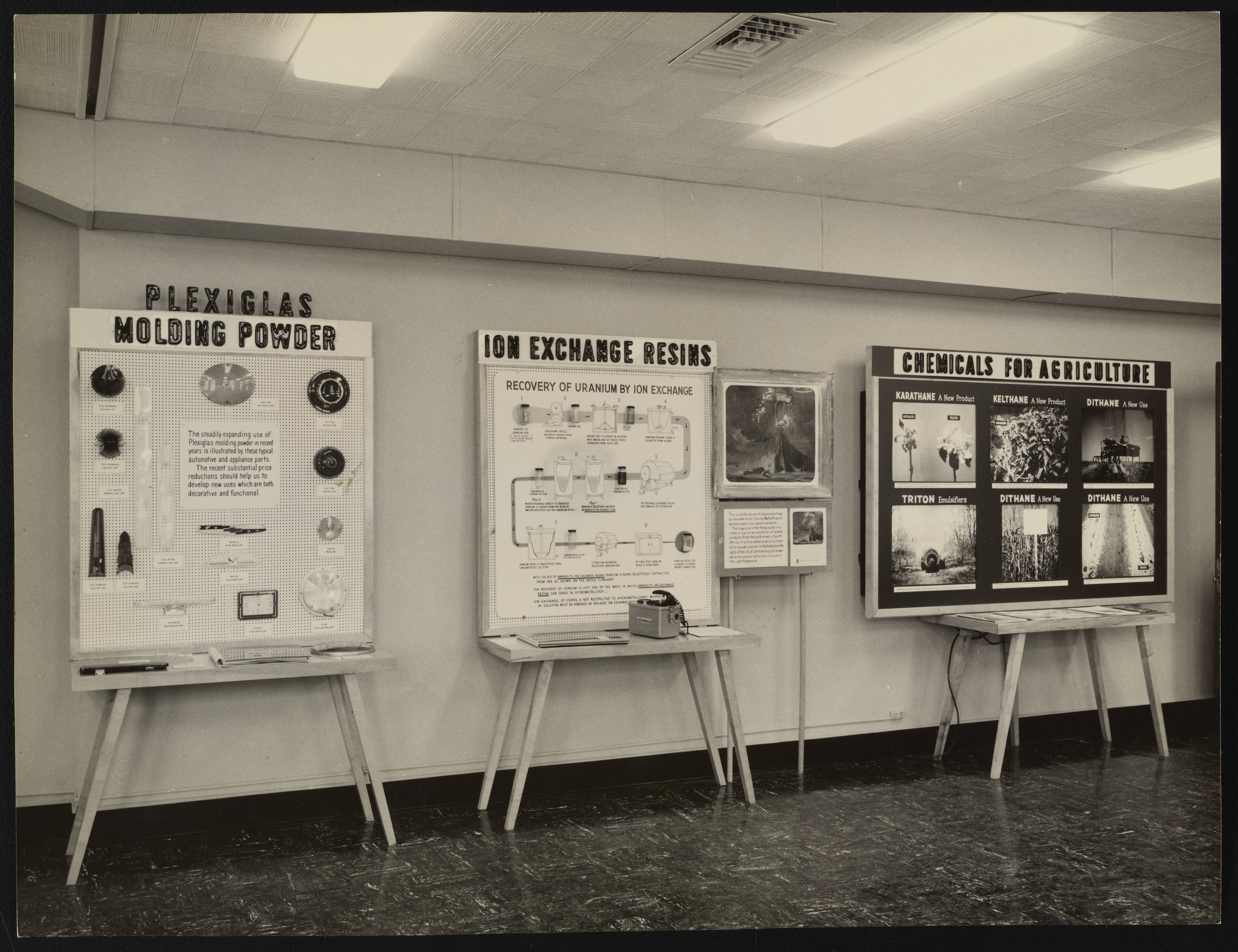Rohm and Haas Company. “Exhibit Boards for Rohm and Haas Stockholders' Meeting,” April 19, 1956. Rohm & Haas Company Archives, Box Photos 20, Folder 28. Science History Institute. Philadelphia. https://digital.sciencehistory.org/works/x2ddok4.