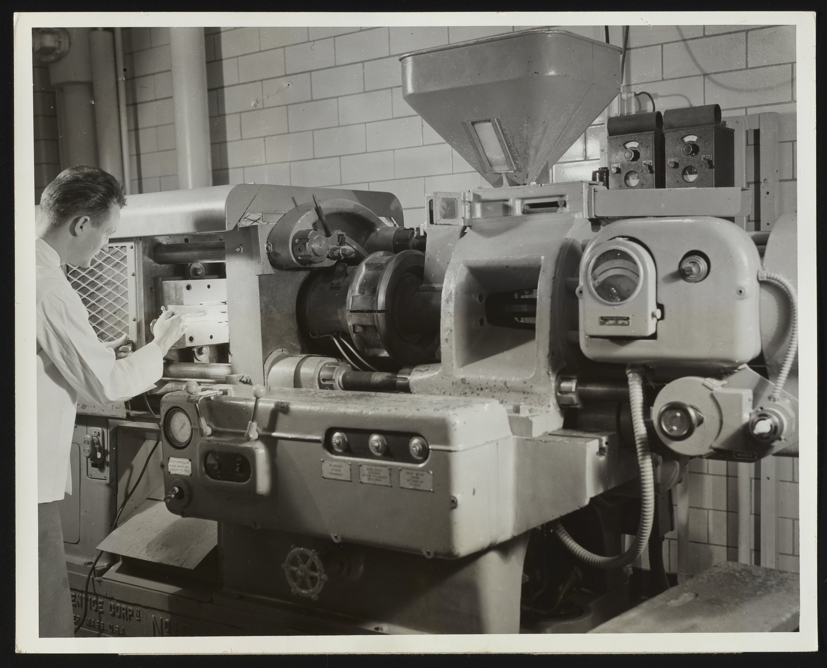 General view of operator J.P. Deran removing injection molded cellulose materials from a 4-ounce Reed Prentice molding apparatus at the Hercules Powder Company plant in Parlin, New Jersey. Per notations accompanying the photograph, the pieces were used to obtain molding and physical data about cellulose materials made from the raw stock manufactured at the plant. The Parlin plant commonly produced ethyl cellulose, nitrocellulose, and cellulose acetate, which were purchased by a variety of public and private industries as a raw material for use in plastics, films, lacquers, and other materials.