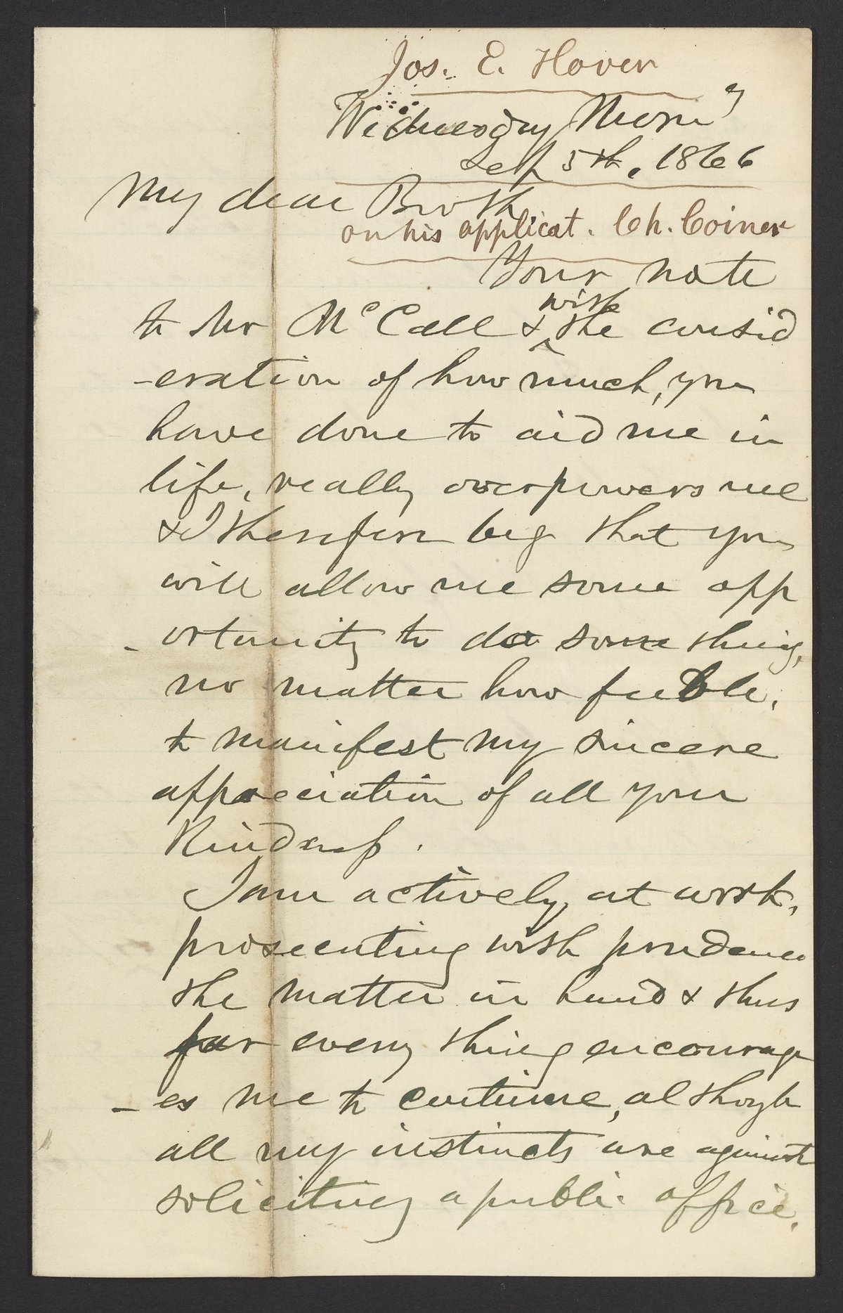 Letter from Joseph E. Hoven to James Curtis Booth, September 5, 1866