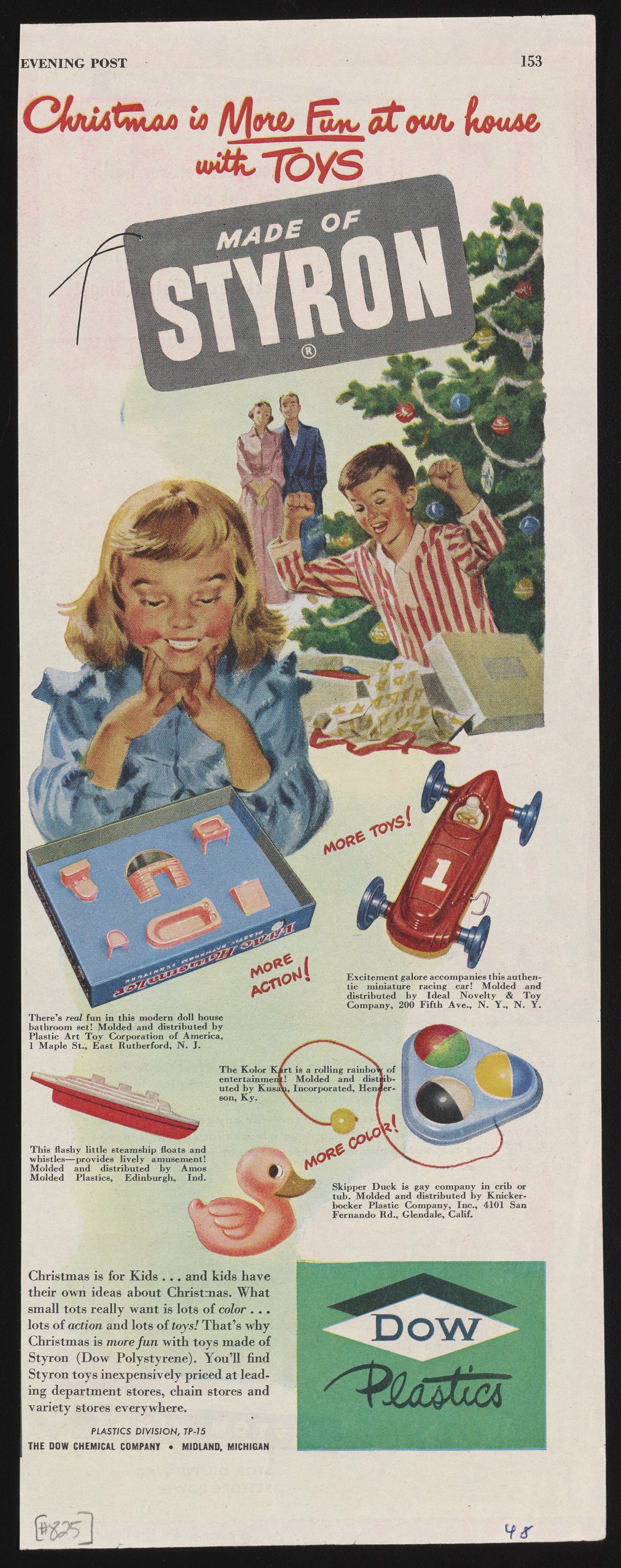 Dow Chemical Company. “Christmas Is More Fun at Our House with Toys Made of Styron,” 1948. Advertisements from the Dow Chemical Historical Collection, Box 9. Science History Institute. Philadelphia. https://digital.sciencehistory.org/works/x5j3gm7.