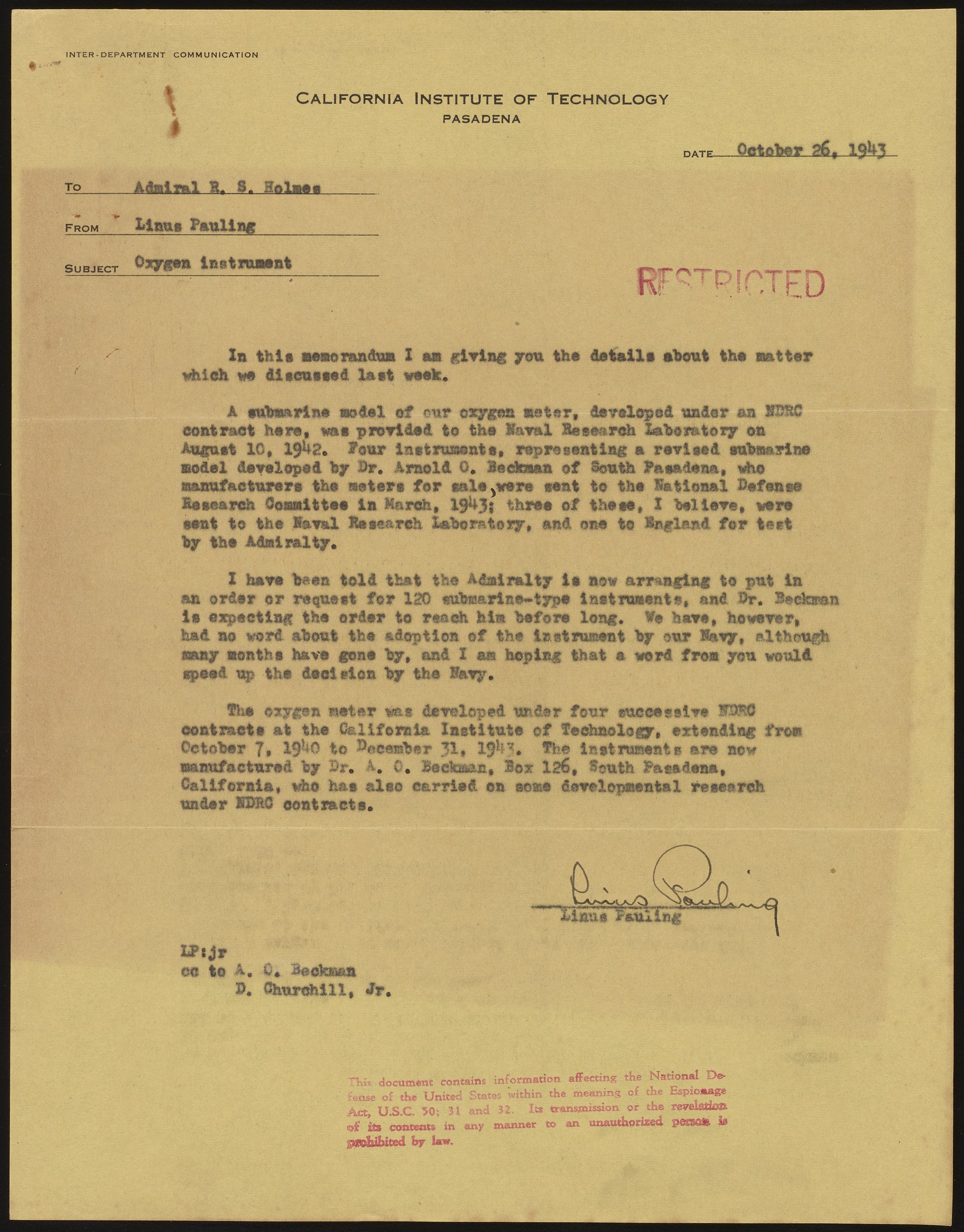 Pauling, Linus. “Memo from Linus Pauling to Admiral R. S. Holmes,” October 26, 1943. Beckman Historical Collection, Box 19, Folder 8. Science History Institute. Philadelphia. https://digital.sciencehistory.org/works/x633f1022.