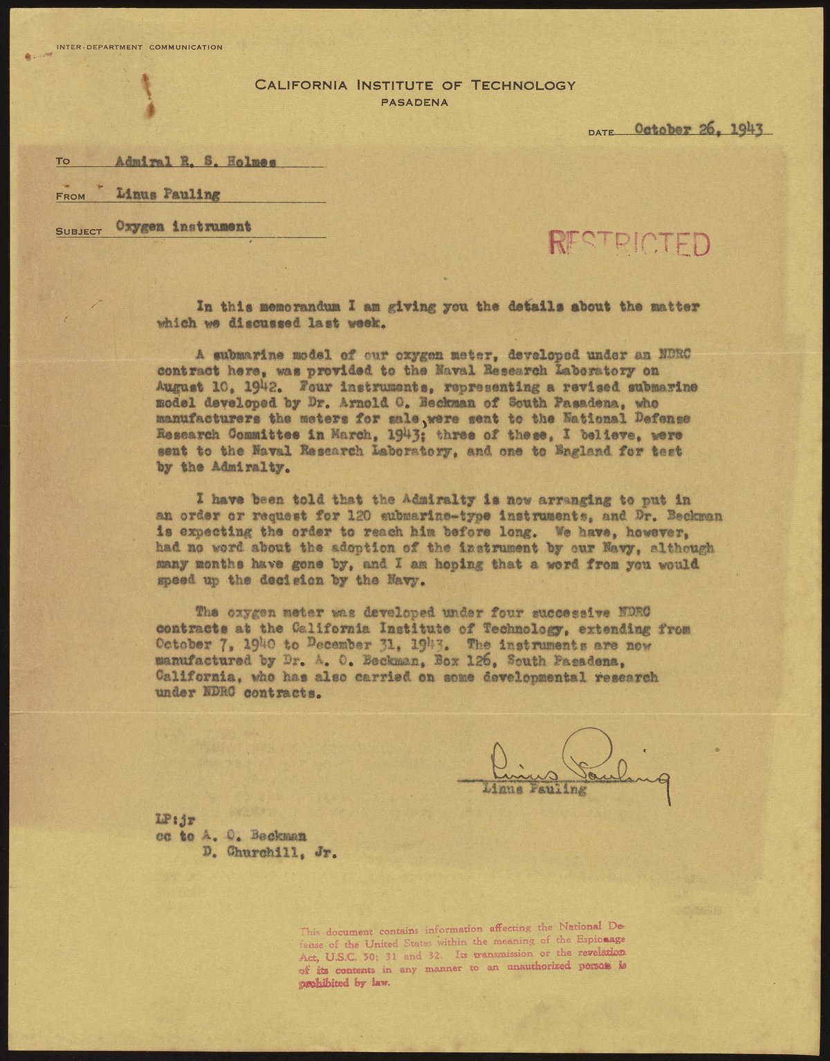Memo regarding Pauling Oxygen Meter submarine model, which was developed by Arnold Beckman during World War II. The British Navy has put in orders for the instrument, and here Pauling inquires as to why the United States Navy has yet to request any oxygen meters.