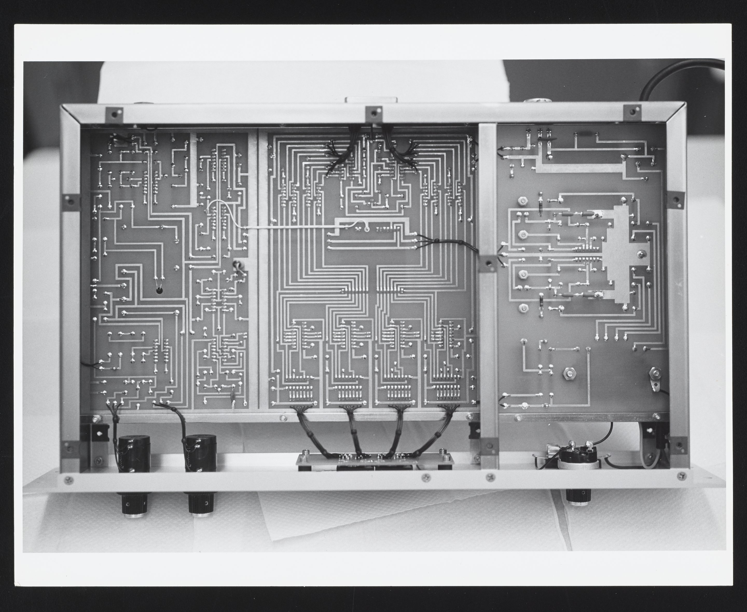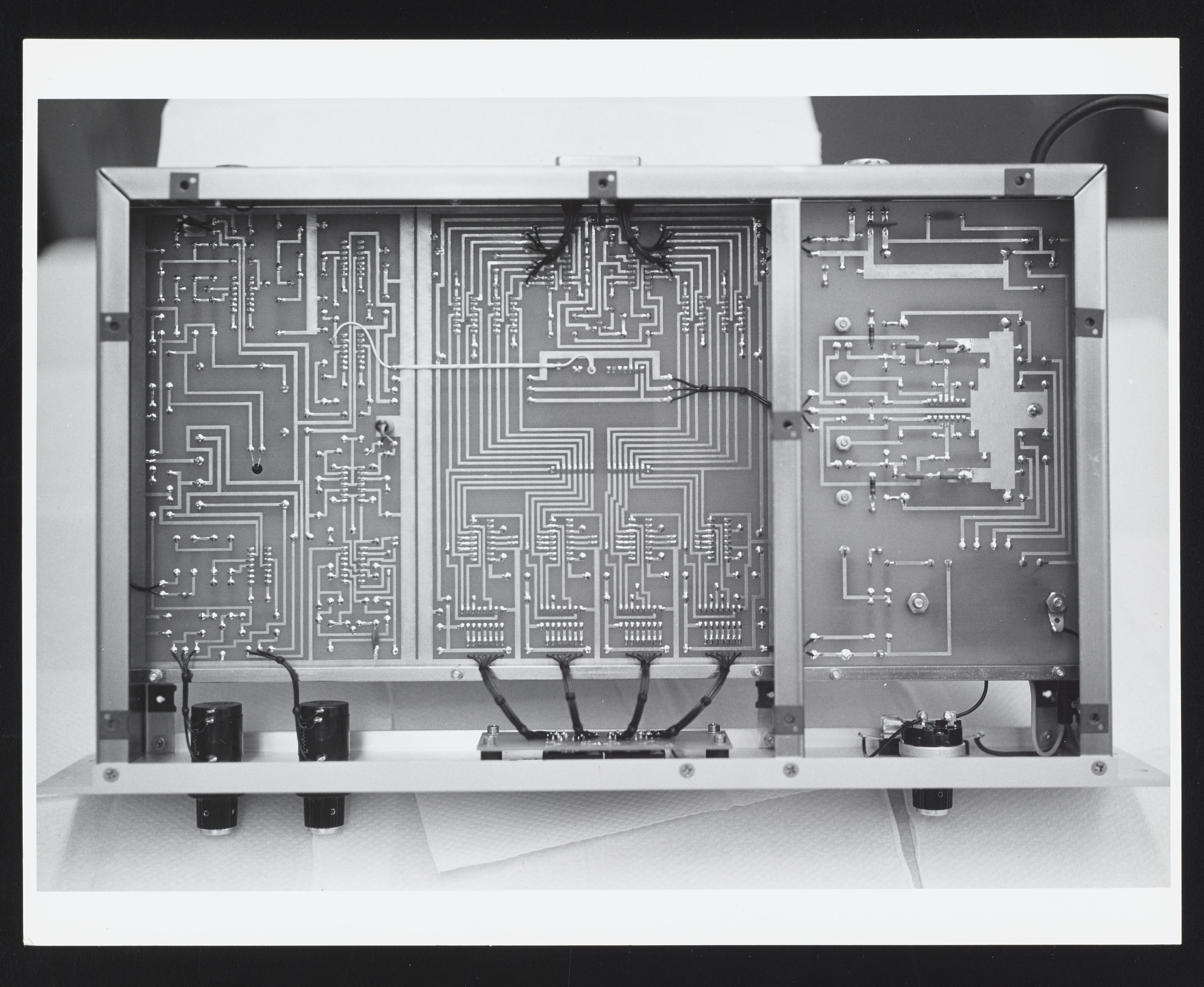 Small JPG1200 x 983px — 142 KBLarge JPG2880 x 2360px — 645 KBFull-sized JPG4378 x 3588px — 1.3 MBOriginal fileTIFF — 4378 x 3588px — 45.0 MBMultiple views of the interior of a Bendix Corporation Model MA-030 Mass Marker designed for use with a Bendix Time-of-Flight Mass Spectrometer, with view of assorted circuits and wires. The Time-of-Flight Mass Spectrometer (TOFMS) was the flagship analytical instrument of the Bendix Corporation.