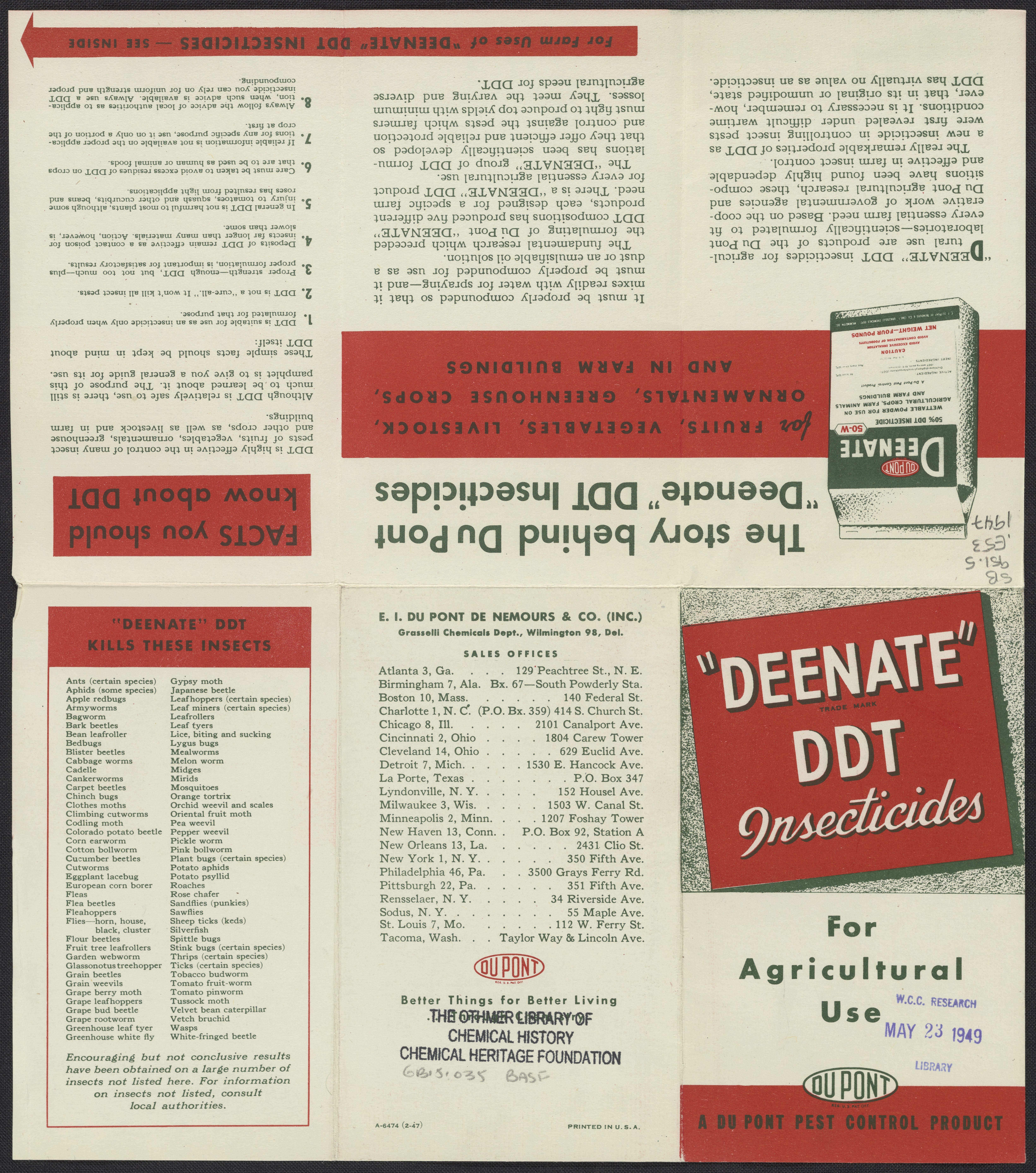 E.I. du Pont de Nemours & Company. Grasselli Chemicals Department. “‘Deenate’, DDT Insecticides for Agricultural Use,” 1947. https://digital.sciencehistory.org/works/x633f207n.