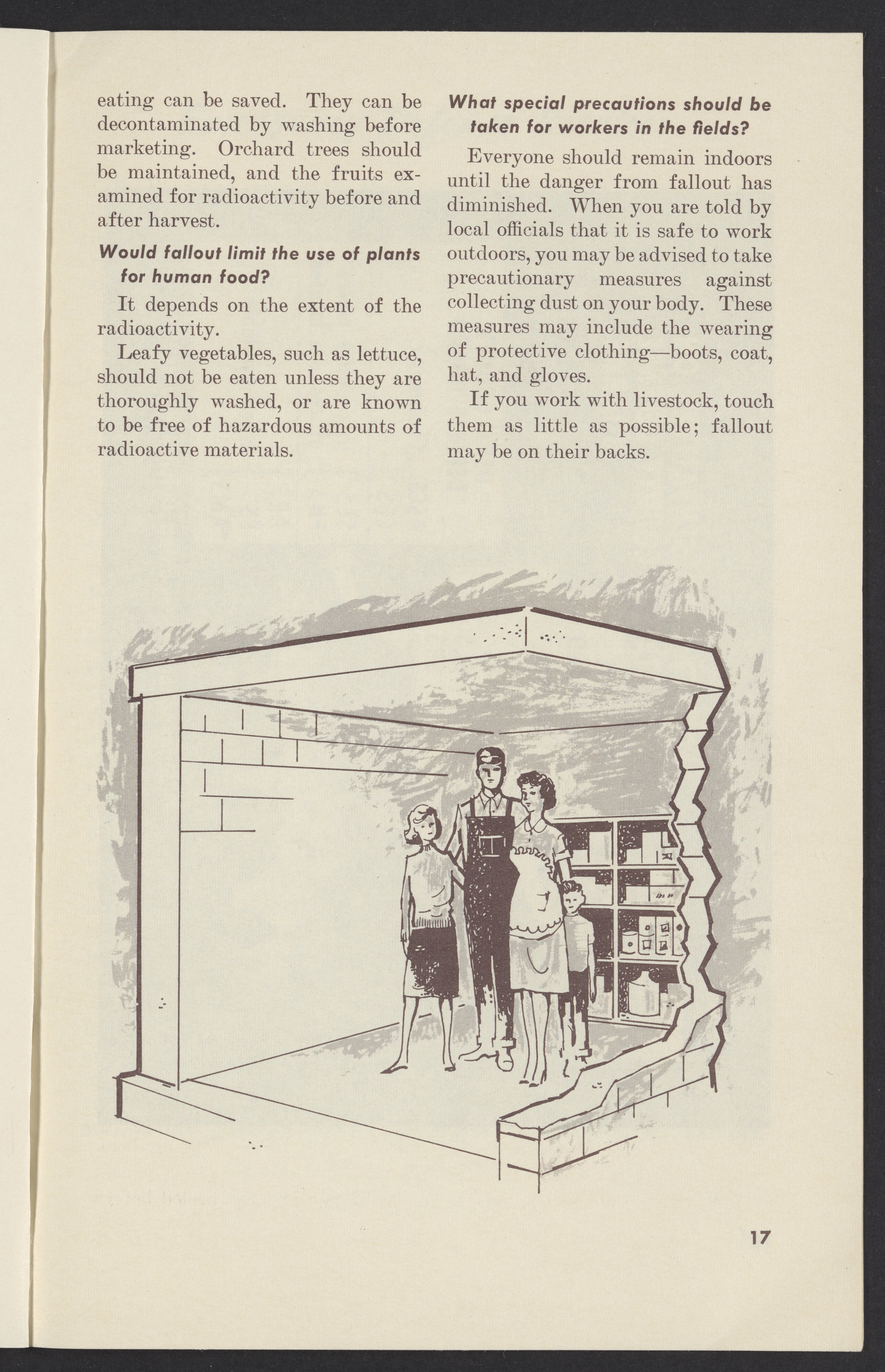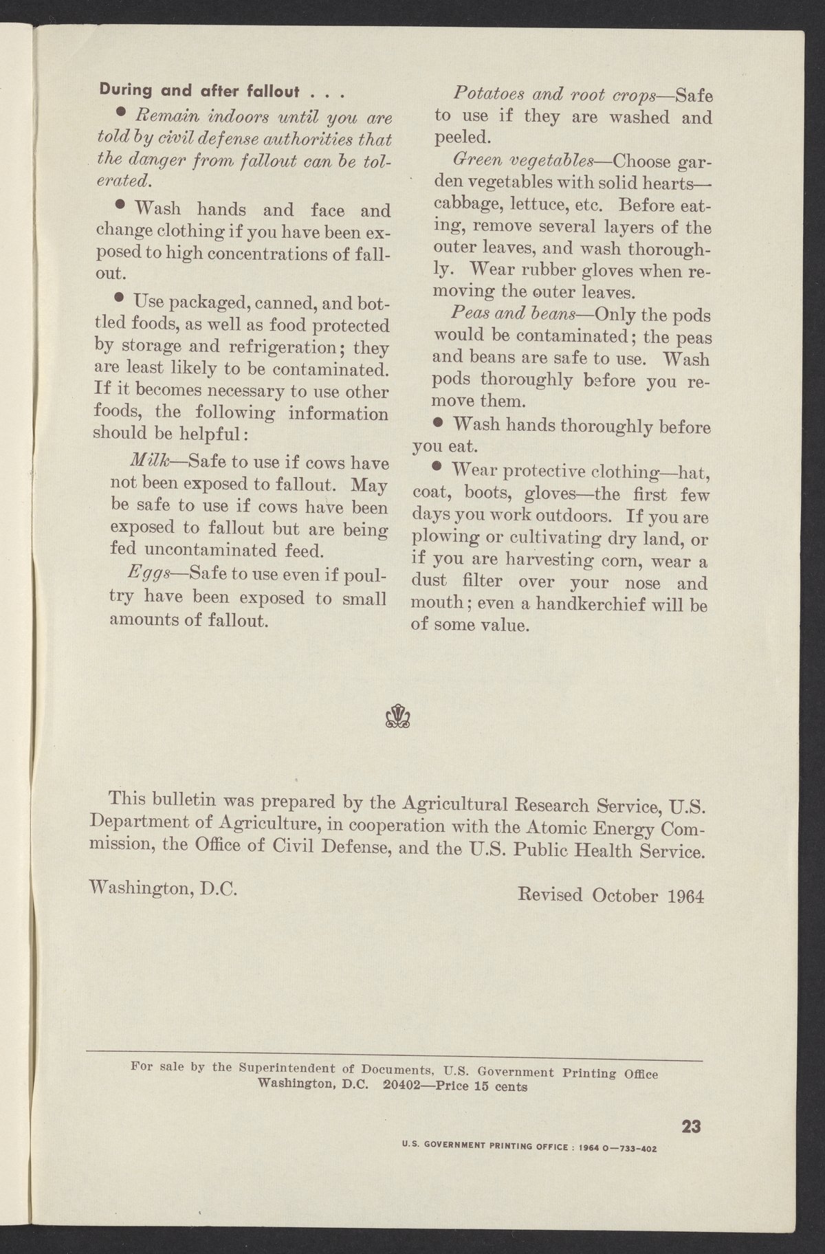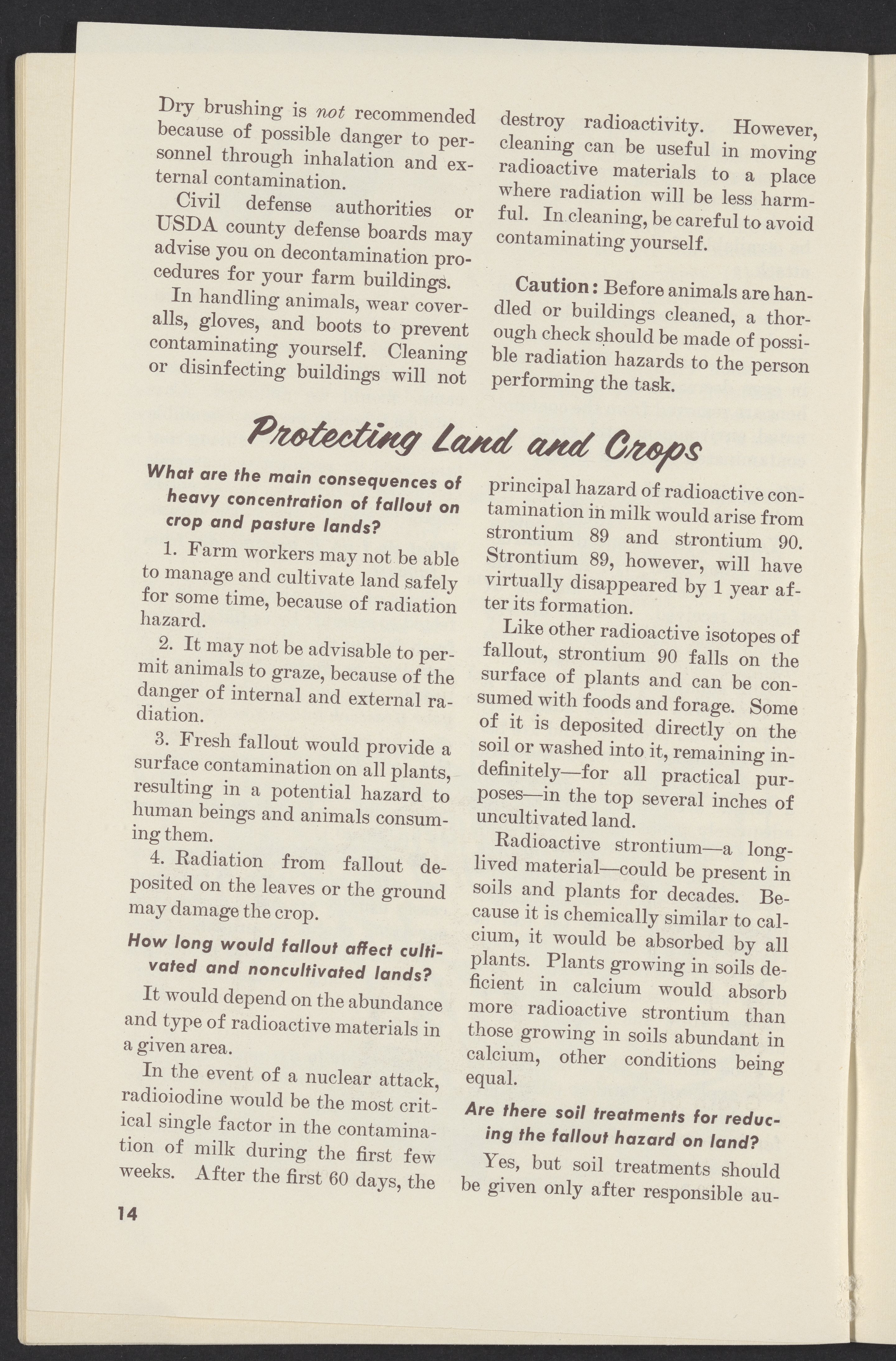 Small JPG1200 x 1831px — 302 KBLarge JPG2880 x 4395px — 1.9 MBFull-sized JPG3761 x 5739px — 3.2 MBOriginal fileTIFF — 3761 x 5739px — 61.8 MBPamphlet published by the United States Department of Agriculture instructing farmers how to protect themselves, their land, crops, and livestock from radioactive fallout in the event of a nuclear attack.