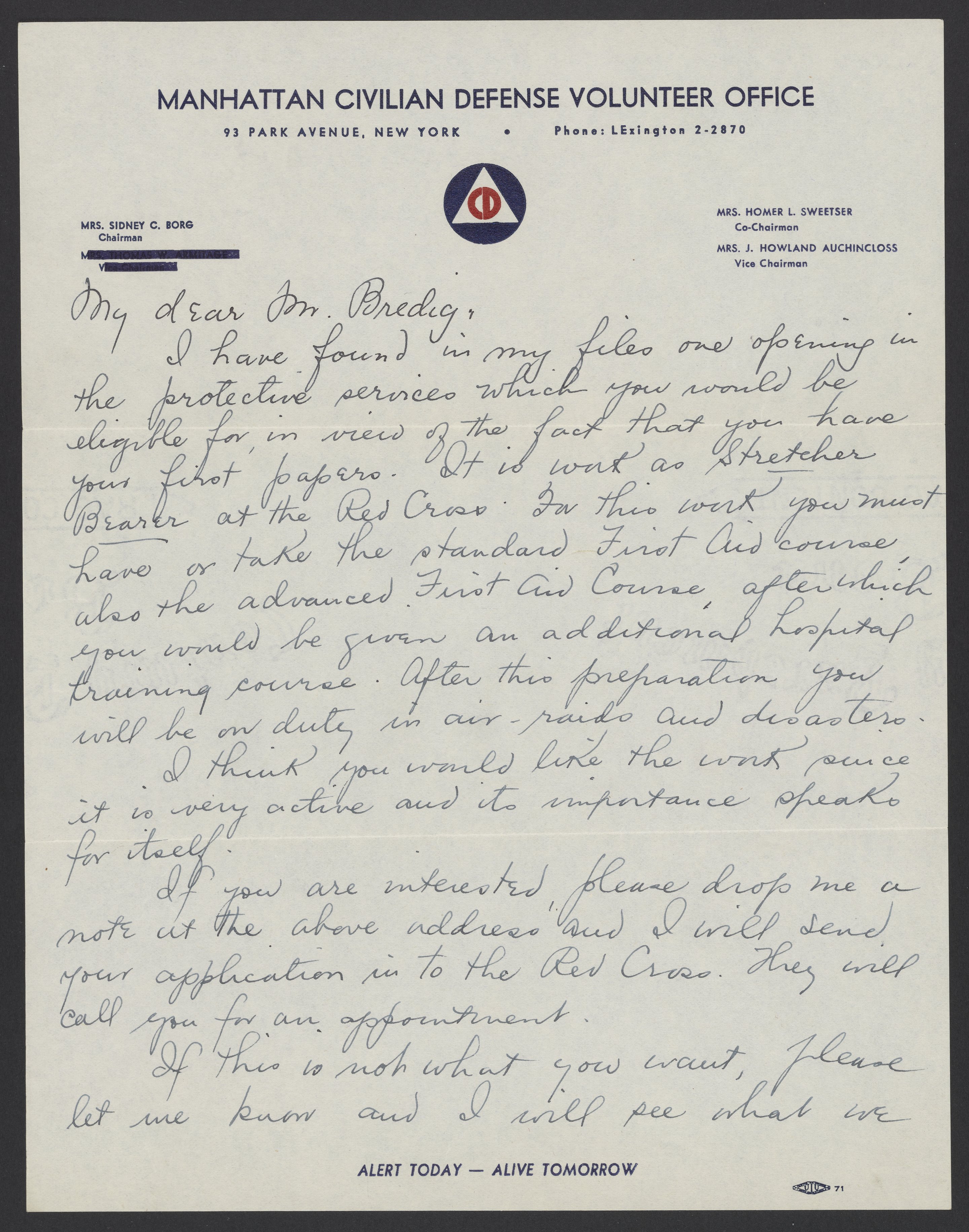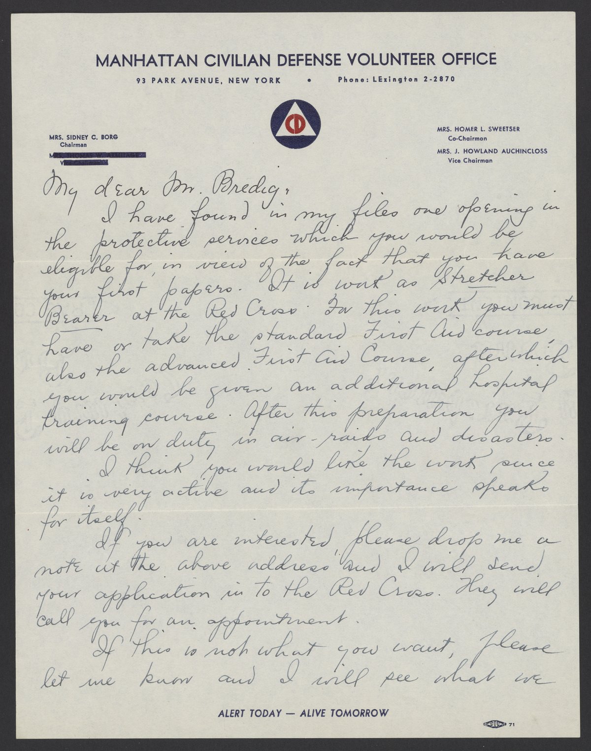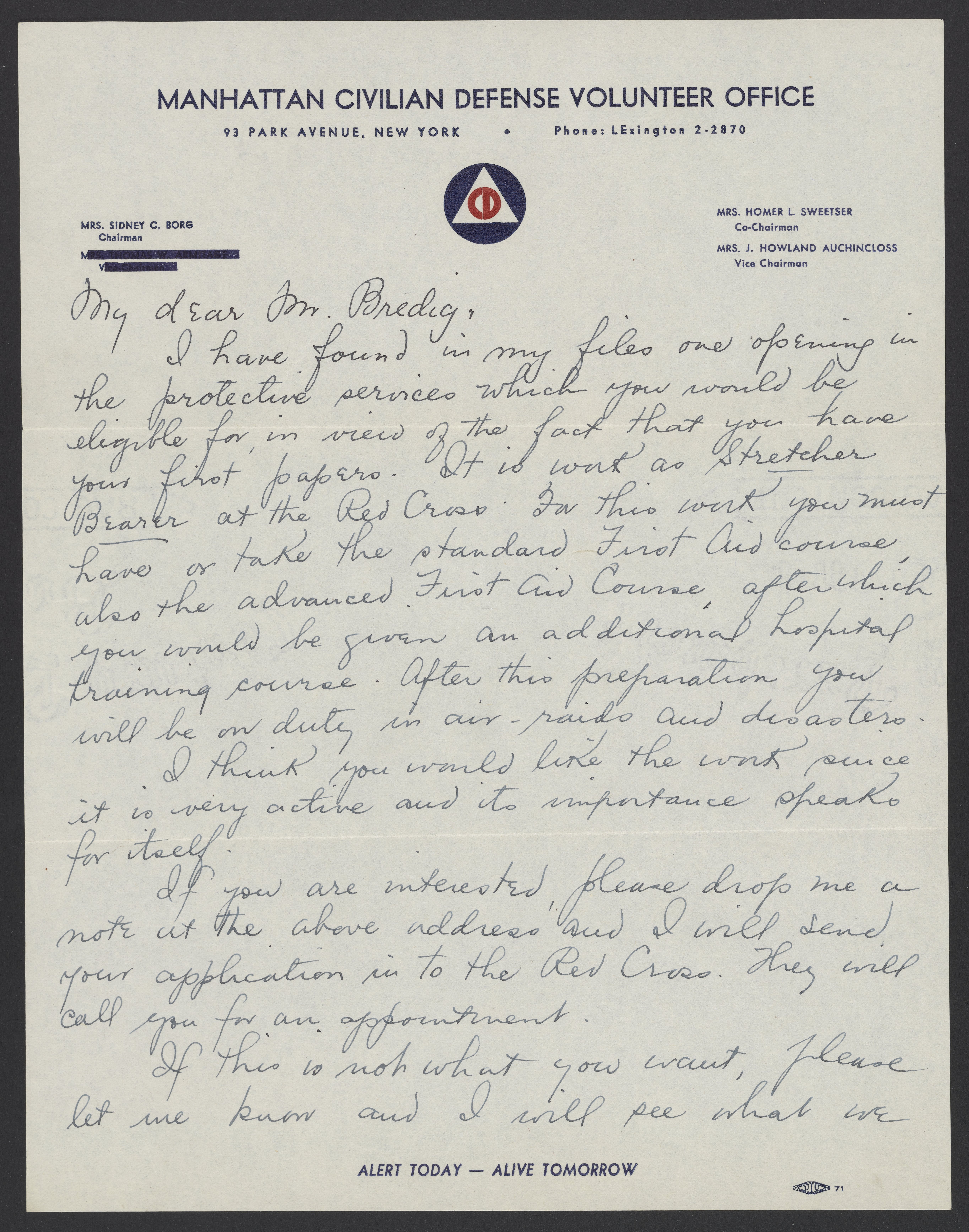Small JPG1200 x 1525px — 293 KBLarge JPG2880 x 3661px — 1.6 MBFull-sized JPG5457 x 6936px — 5.4 MBOriginal fileTIFF — 5457 x 6936px — 108 MBThe Manhattan civilian defense volunteer office informs Max Bredig (1902-1977) that a volunteer position has opened in the protective services division.
